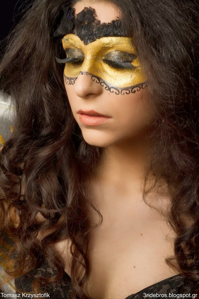 The look was inspired from the Victoria's secret fashion show. Only with a masquarade twist! The tones where gold n' black and these colors are really in till this day! My make-up was done from this fabulous girl http://www.facebook.com/vaso.loulou.9. I thank her so much for this great look! Gold, glitter and lace (! ?) made the perfect combo on this make up mask!