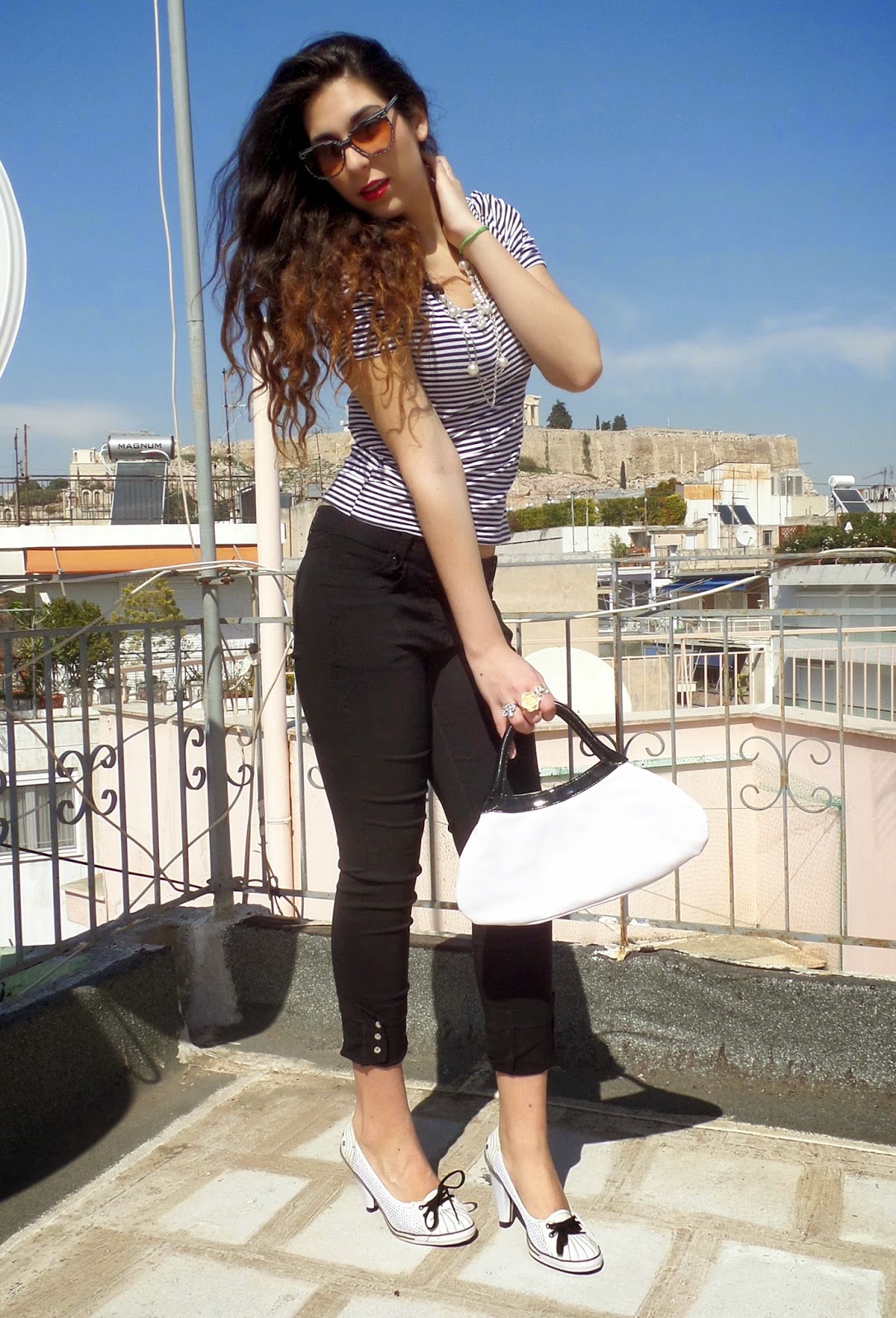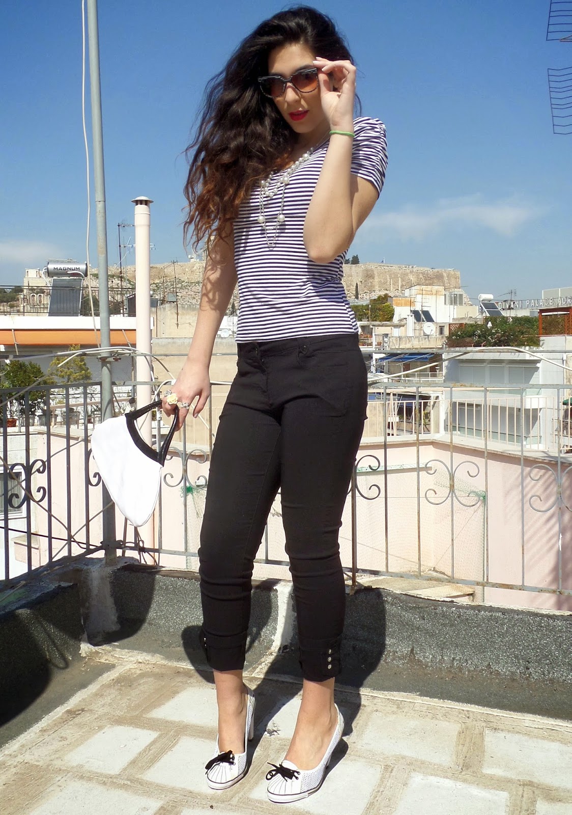 Hello Fashionistas! Today's Post smells like summer, I feel it coming already, so I decided that blue stripes red lips and sun would be the perfect combo! This outfit is kinda bussiness like, but on a hot summer day, of course I also used the sporty n' chic trend-once again- by adding my favorite converse-like, white pumps and combining them with pearls. I think it gives class and an easy going-summery feeling! Red Lips was an old hollywood glam touch to this whole look. Are you ready for summer? I-with such an outfit- most certainly am!