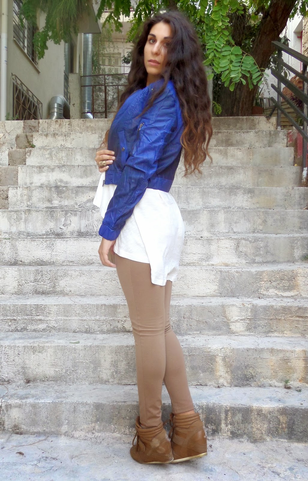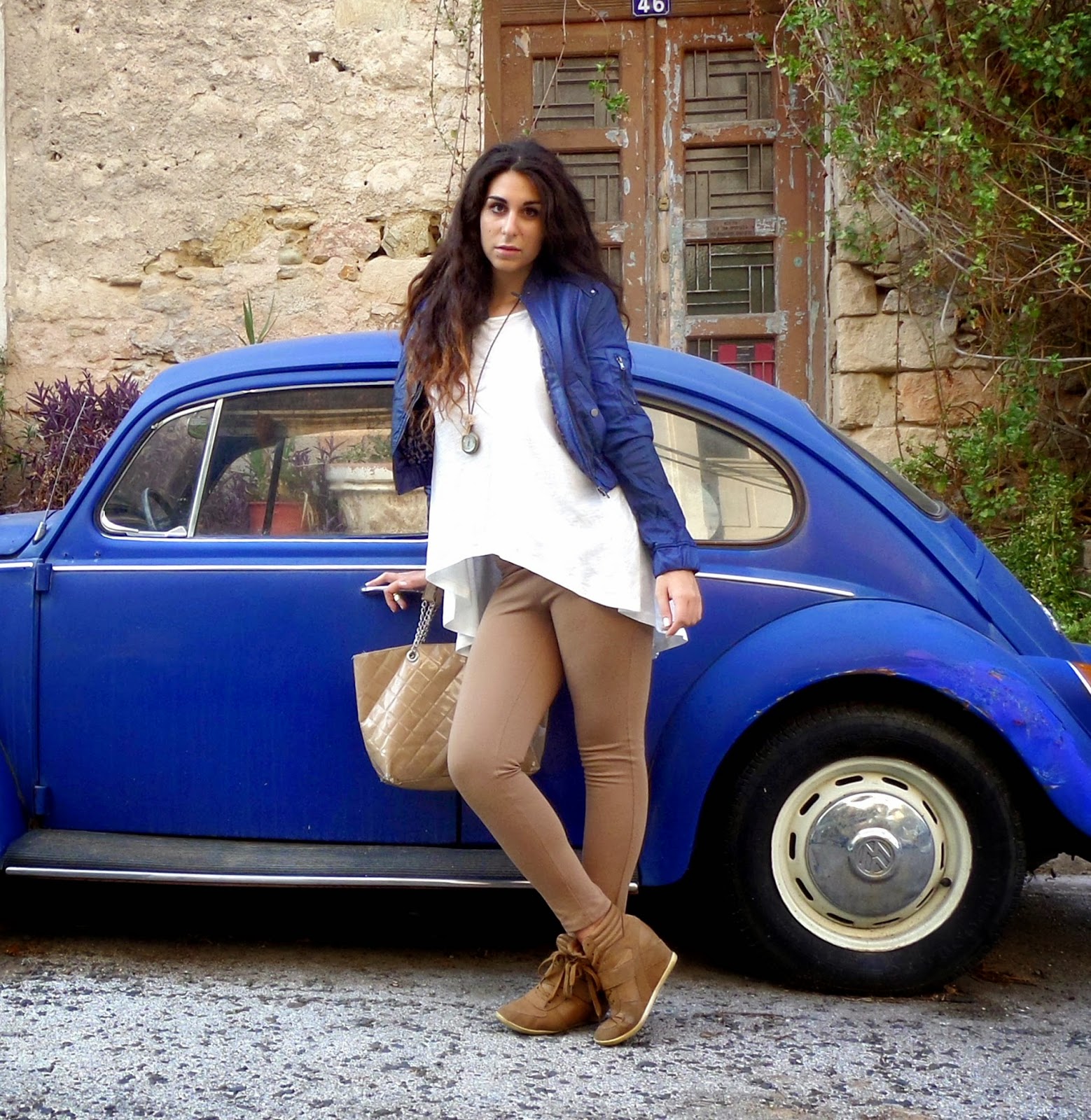 Hello Fashionistas! Even though I’m not so thrilled about it, Autumn is here and I’m trying to look on the bright side of it… The clothes of course! Don’t tell me that you didn’t miss the fabulous jackets or your favorite booties, cause I won’t believe you! This fall camel is the new ‘’it’’ color and I just happen to love it. So I headed to Cento Jeans and chose this fabulous elastic pair of pants, that are perfect for a ‘’back to city’’ look and combined them with a simple white layered blouse and a perfect deep blue, leather jacket. Ohh I missed jackets! Plus, blue and camel work really well together, not to mention how chilly it gets in the evening. So my advice is, gear up with a fantastic new wardrobe and enjoy Fall… It’s all about new beginnings after all!