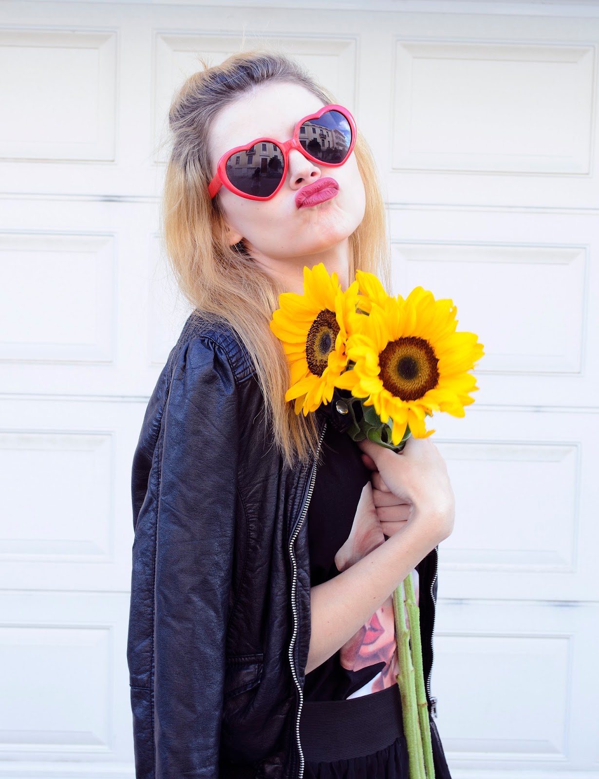 What a fun outfit! I love the heart sunglasses and the flowers you're holding!