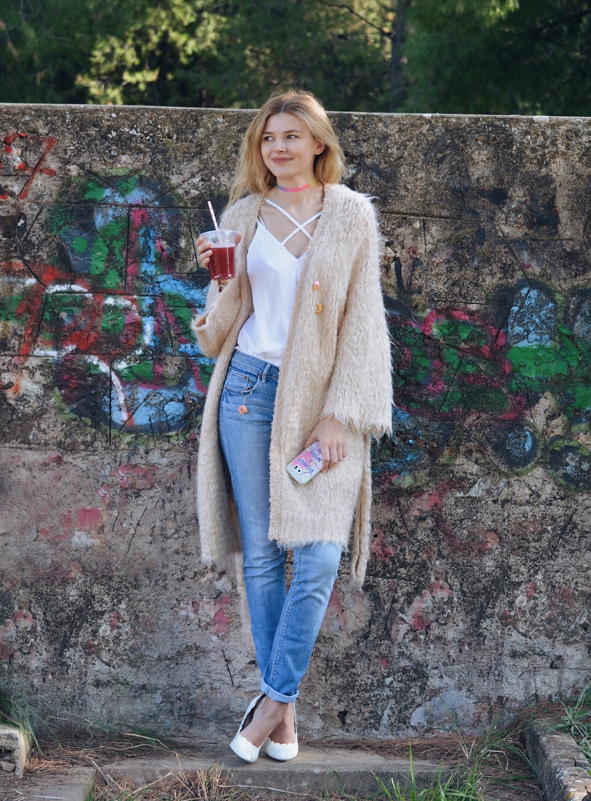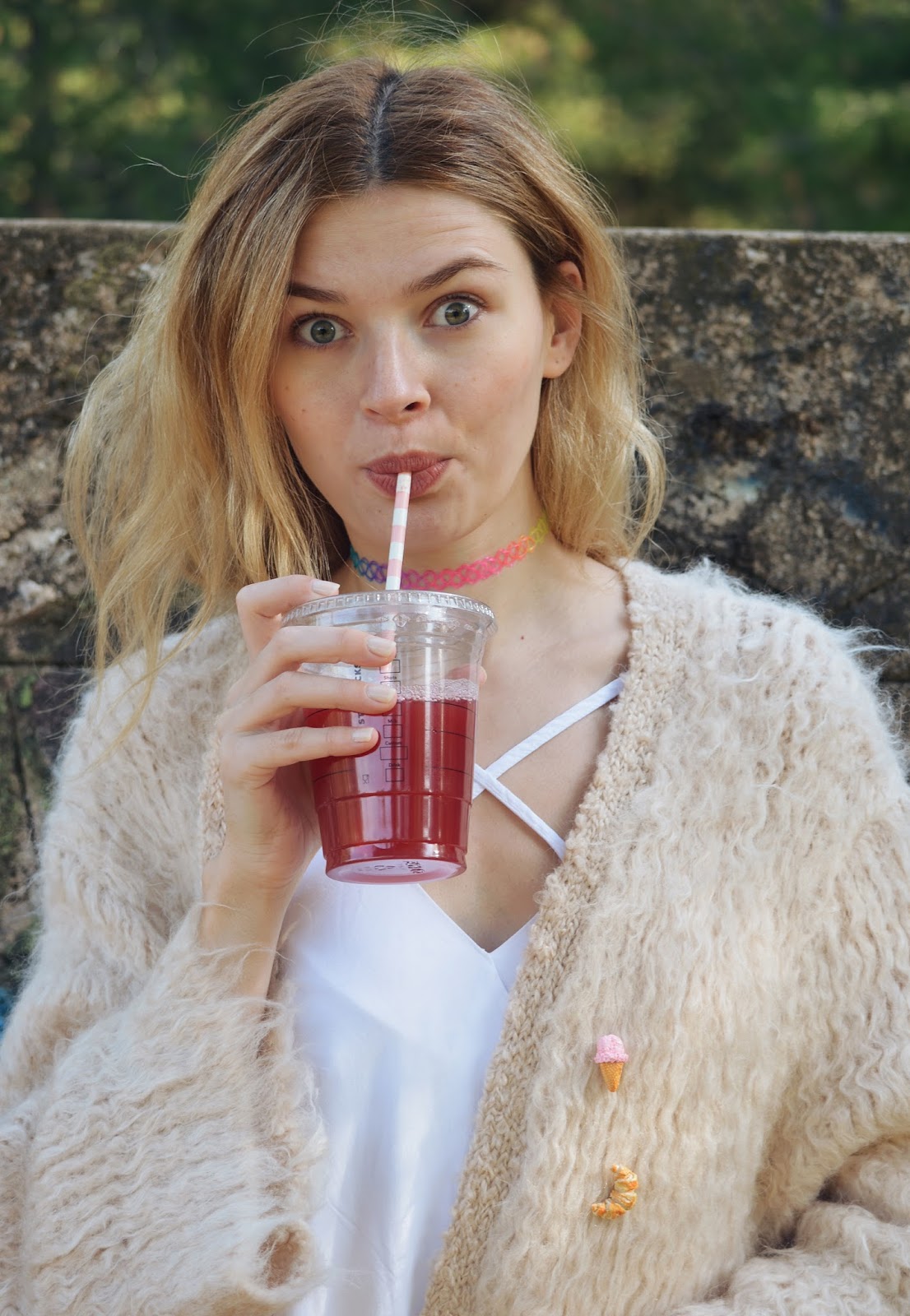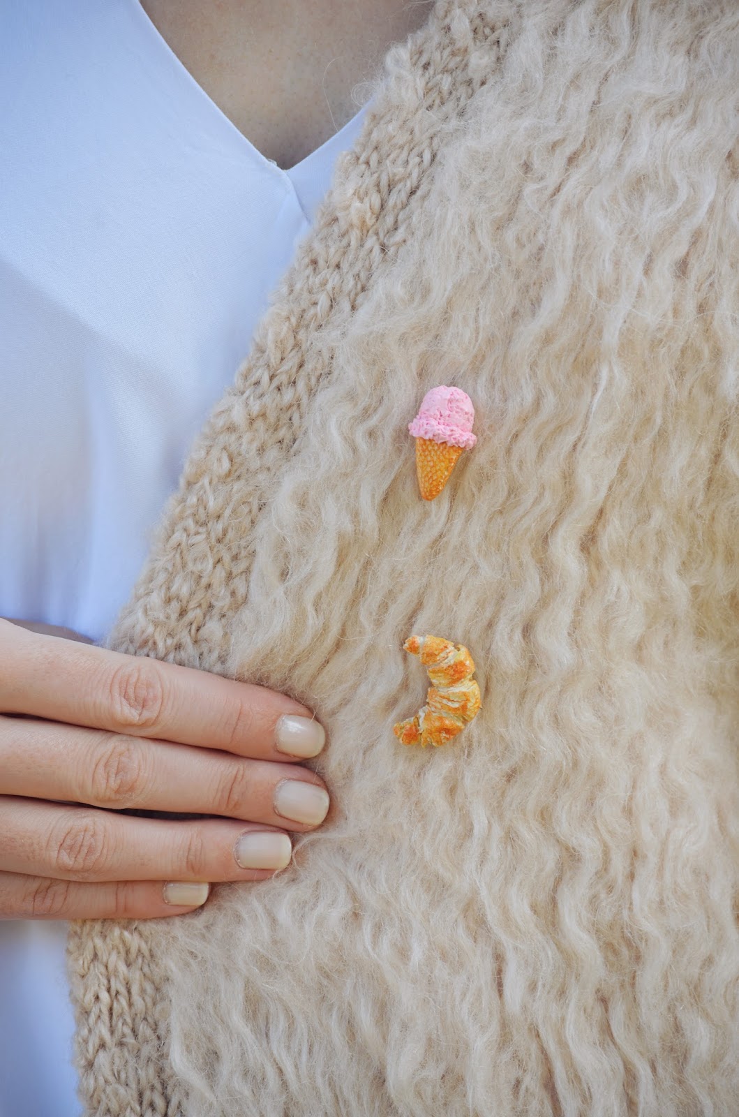 I received this cute pins (croissant and ice cream) & this adorable donut keychain many months ago, but I didn't find the time and the perfect outfit to match with them. Tadaa and here it is! This brand was created in 2012 by Karen Firth in Canada. She combined love for food and miniatures into one great hobby. Her inspiration comes from all types of food and all things that are colorful and fun. You can find on Karen's shop handcrafted taco bracelet, cupcakes earrings, banana earrings, burrito pin and many many more. So if you want something different and super cute, don't hesitate to check BITE SIZE.