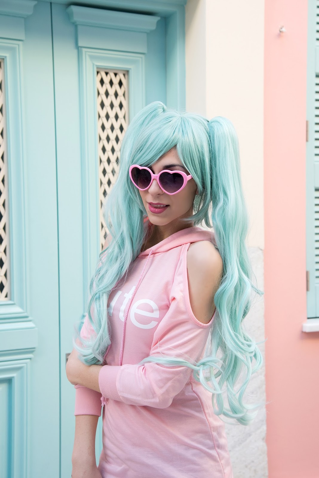 How cute is this look, right?? I’m usually not the one to go sporty, but this cute Hollow Out Hoodie Dress stole my heart forever… I wore it as a top because *cold* but I loved it so much and the open shoulders just gave the whole look a frisky touch! I spotted it at www.lupsona.com, where you can find amazing sporty and sexy pieces in unbelievable prices… The rest of my outfit is pretty basic and simple for me, but I love it for everyday! Of course I had to make it extra… Let’s talk about my new wig! I’m in love with my Vocaloid Hatsune Miku Wig! It is for cosplay based on a manga character, however I used it as part of the look, since you know it’s mint and cute and has pigtails! Hihi!! You all know how much I rely on wigs lately for trying different looks… So, if you are ready for a fun change too visit StarLight Wigs for more cosplay, lace-front and simple wigs of amazing quality and affordable prices! I’m also loving changing contact lenses, so this time I’m wearing my new O-Lenses Caribe Con- Pinkcircle lenses… They are a bit more subtle than the ones I’ve tried before and they accentuate my brown eyes by giving them a more natural, pink-ish hue! I’m really digging the look! For more circle lenses you can click on PINKICON. I loved the mint-pink combo of this look and as you can clearly see, I’m totally matching my background… the whole thing was really random but I loved, loved, loved the result! Responsible for that result is, once more, Achilleas Vogdanidis of Vogdanidis & Sons Photography- Cinematography! I’m so thankful for the cute, bright and dreamy photos he once more provided for me… If you’d like to capture your special, colorful and magical moments such as weddings, christenings, family occasions, events etc. Click on www.vogdanidis.com and make your moments last forever! Btw, let me tell you, people were passing by all the time, asking for pictures with us and asking us what we were shooting for… It was a bit cute, but surreal as well… hihi!! I hope you liked my look and until next time, be pink, be you, be CUTE!!