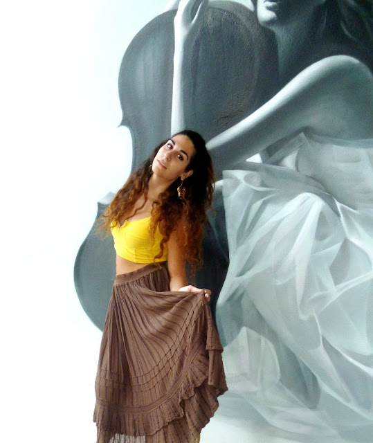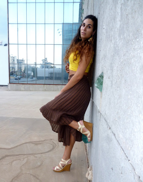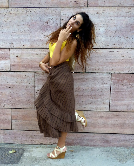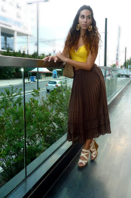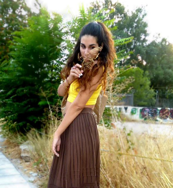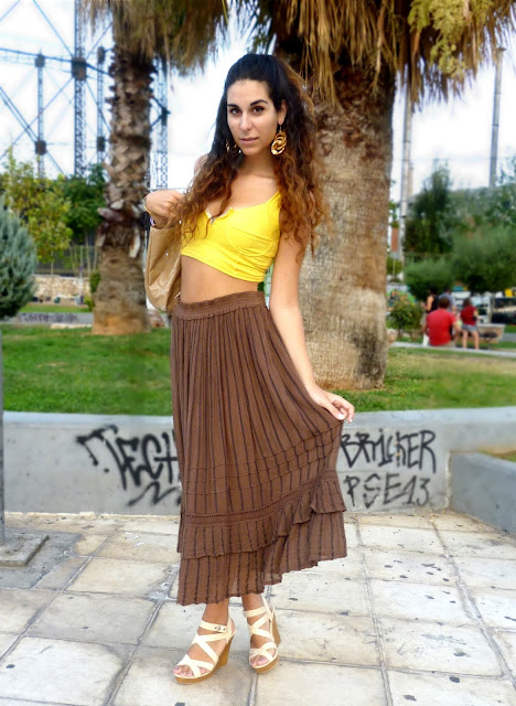 Summer maybe gone here but the feeling is definitely still here and we love it ! This time I decided to go for the maxi to midi skirt look ! Maxi and midi skirts have been really in for some time now ! And when high wasted and combined with crop tops they are the bomb! I used this brown (kinda woodeny) skirt and paired it with my fav yellow crop top ! Yellow and brown are always a good combo for me... I of course also used gold accesories and a gold hair cuff to style my hair half up and half down -this hairdo is soo makin' a comeback this year- cause I think brown, gold ,yellow etc are so nicely blendin' together. I really think that those colors also compliment my tan and hair ! Lucky me ! what do u think? I also went for wedges as per usual... comfy and really suitable ! Plus : this skirt was really boho/hippie/gypsy style ! This style is really in for the summer and I think it really suits me... It's kinda carefree n' fun and I absolutely love it ! Some people even said that I looked like Esmeralda (yayy) one of my fav disney princesses! How cool is that right?? I went for a fab waffle on the roofgarden of the Athens Heart mall etc etc ! Still havin' fun.. !!
