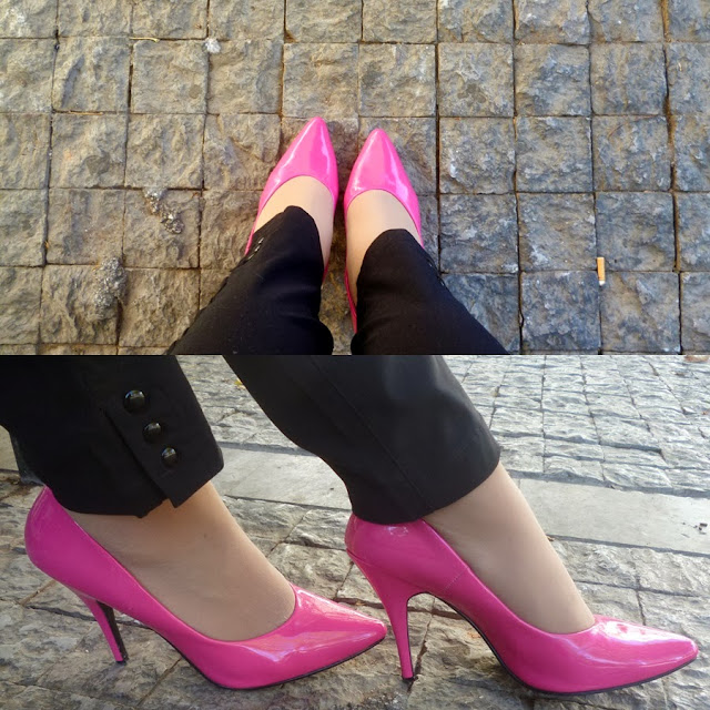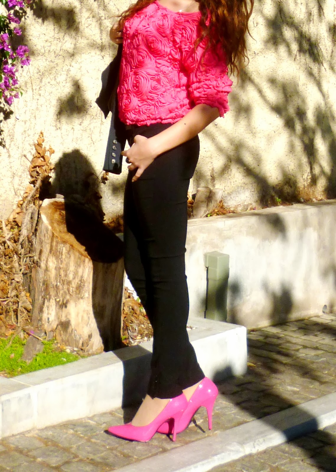 This outfit looks business like, but with a hot pink twist! I paired this wonderful blouse full of roses from this site Choies that I'm always telling you about(and hurry-up cause their sales are ah-maze!) with black pants, blazer for a super chic outfit! Oh and my Oh-so-fab Barbie Pupms! Seriously It's like I robbed her closet...