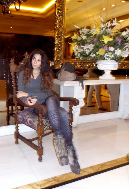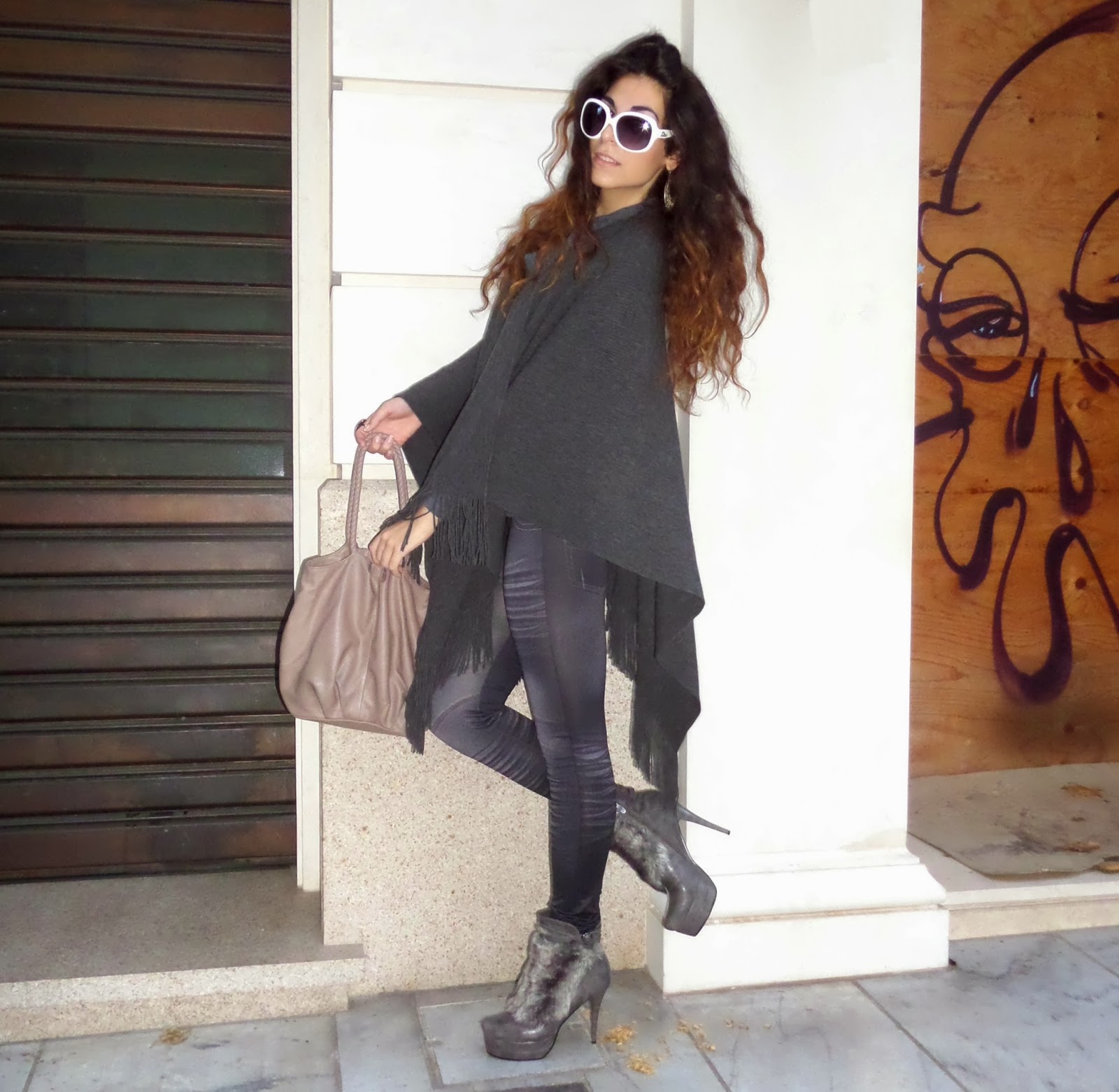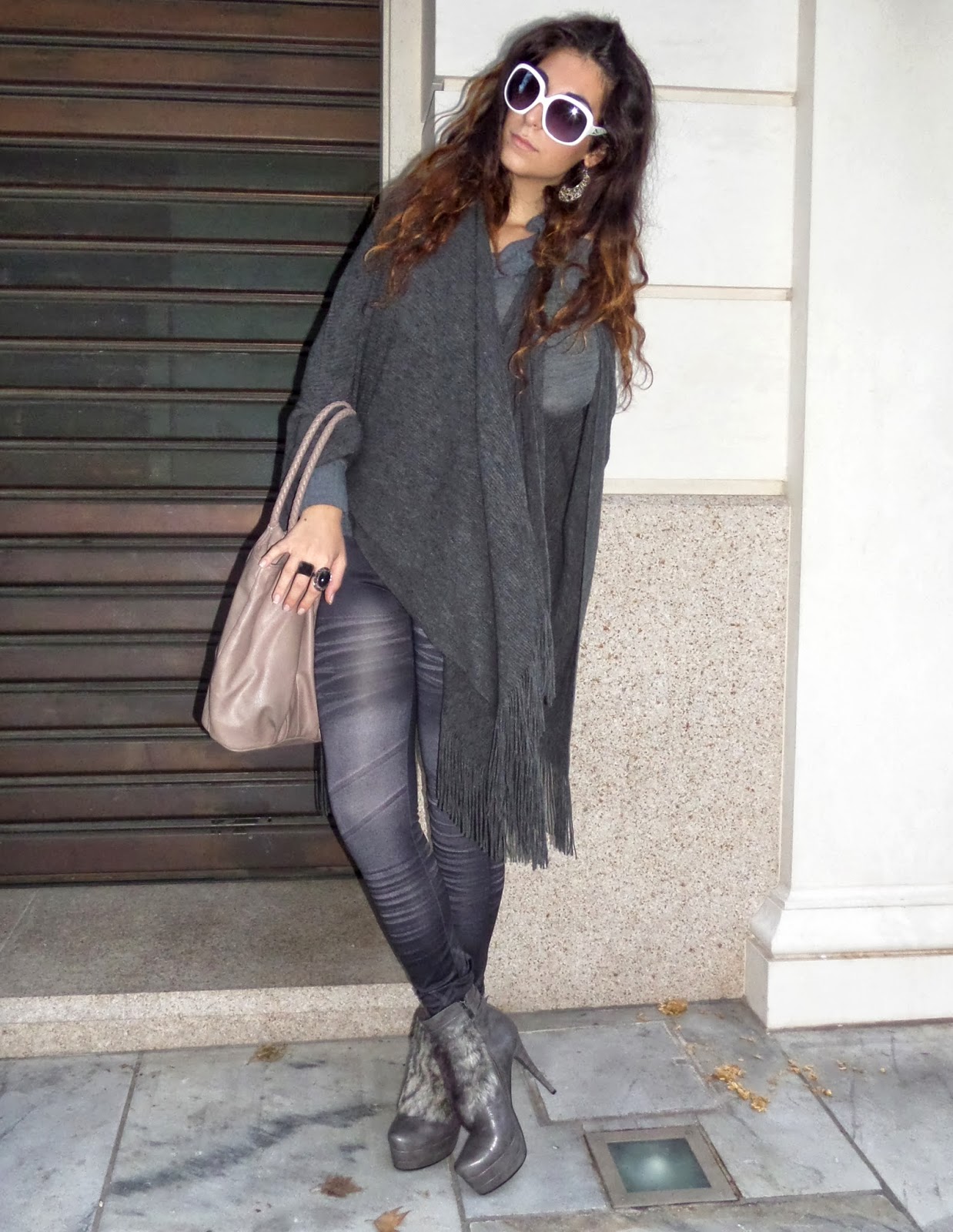 Hello Fashionistas! Winter is here and Xmas is very close... Glam is also here! For this look I chose to go for the safest color for a total look this season! Grey... It's hot, it's in(especially now with the books!) and it's perfect for this time of the year. Personally I prefer grey than black for a head-to-toe look! Here I went for many many shades of this colour, I mixed and matched many textures, such as, faux-fur, wool, leather etc. Since oversized is also really in, this huge cape was exactly what I needed! I'm also in love with those leggings, which look like jeans, isn't it great? It's like skinny pants, but they are leggings!
