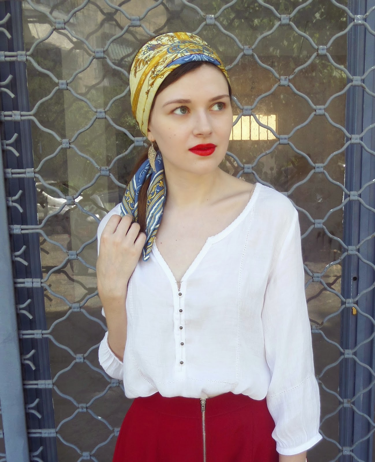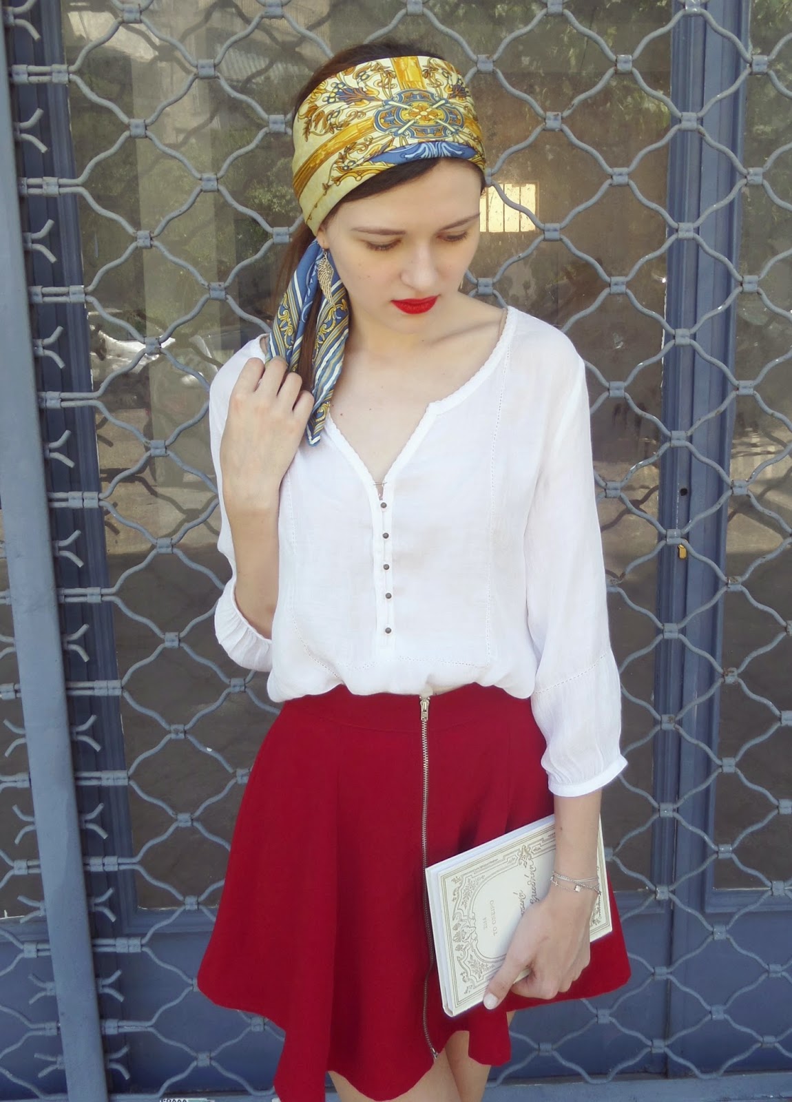 Hello my fashionistas! My summer vacation has finally started so you'll be seeing more pictures on our fb page :) . I really like this vintage scarf and I was trying to find a way to combine it for some time now, because it's such a statement piece on itself I figured that the best way to wear it would be with a more simple outfit. As for the other ''accessories'' I chose, once more, instead of a bag, to hold a wonderful book. It's called "The Dream" by Emile Zola and I recommend you to read it. Last but not least, for the end of this post, I kept Paula's Fleur from INSPIRATION POINT drawing for our blog and we thank her so much and we are wishing her the best of luck :) . Have fun and I'm waiting for opinions. Kisses :)