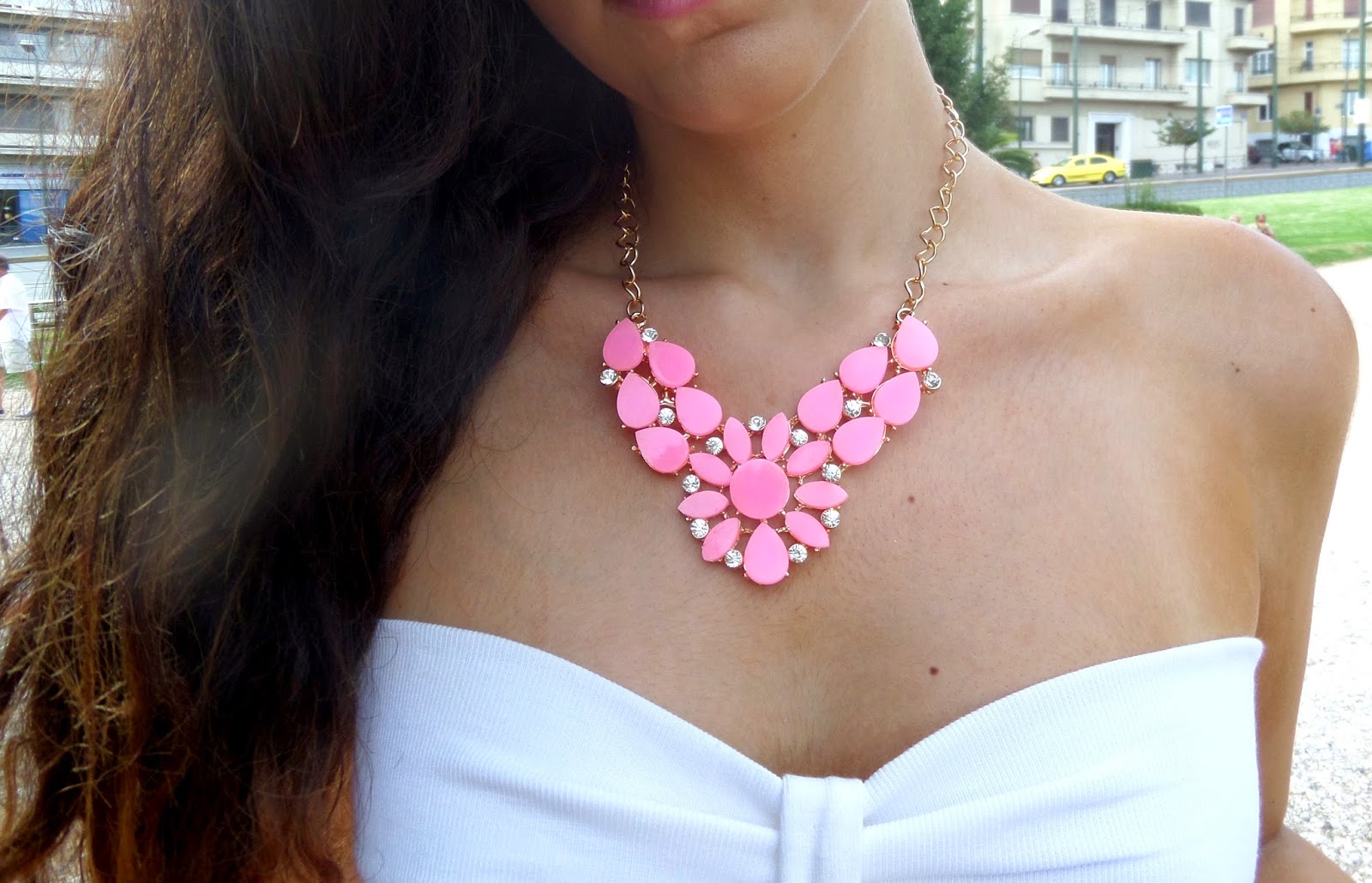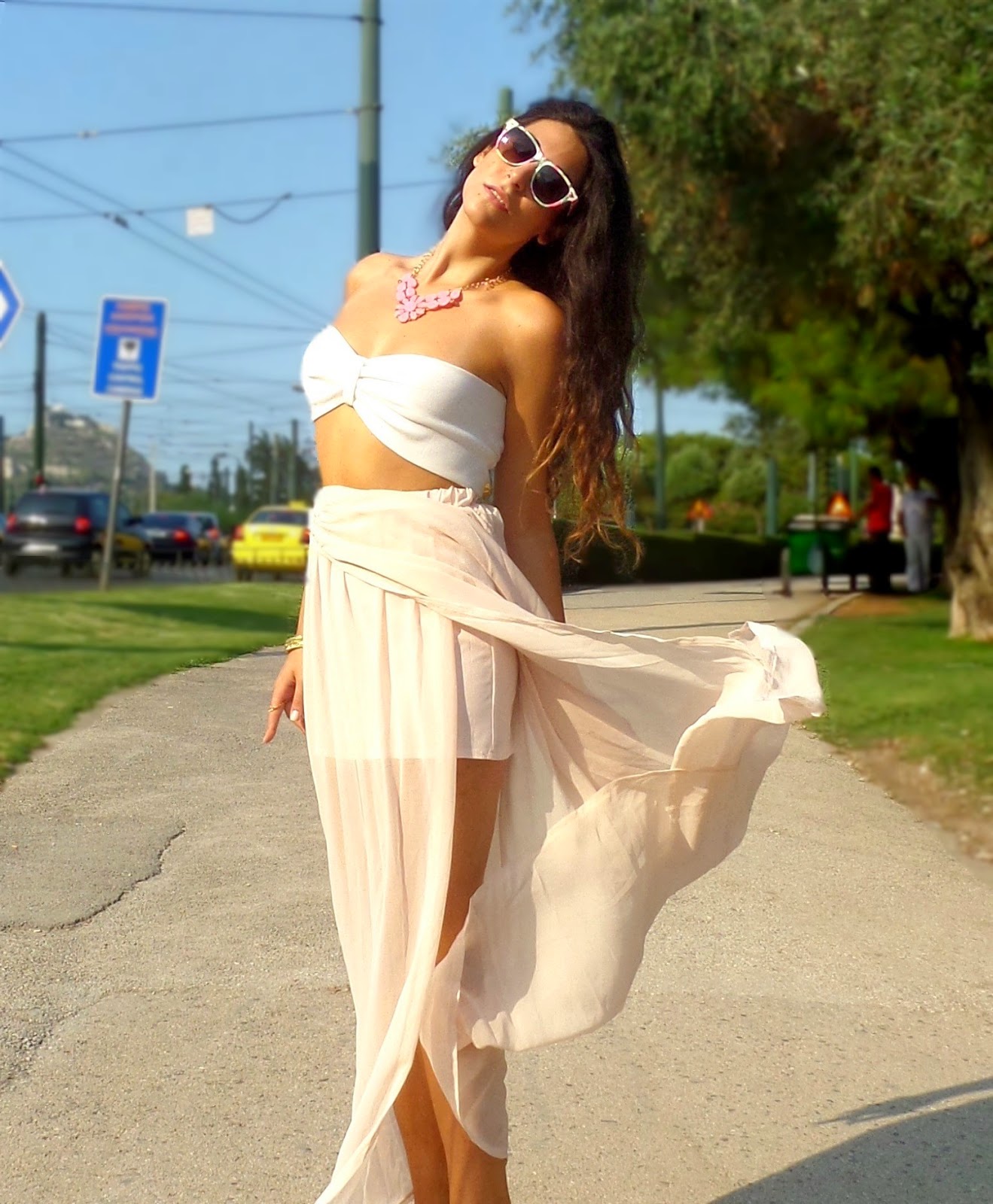 Hello my dear Fashionistas! As you all know summer is the perfect time to go for a maxi skirt or dress. Maxi gives a flowing, summery and oh-so-feminine touch to the look and thats why I chose to wear this fabulous and absolutely girly, flowy maxi skirt, which I found at the LookBook Store. Since its high waisted, I decided that a simple, white, bow-like, crop top would be the perfect thing to wear it with and it turned out to be great! High waisted skirts and crop tops are still so in, for two summers in a row now. I really wanted this outfit to be classy and feminine, so pink and gold jewelery were exactly what needed for this look to be completed. If you are not much of a high-heels or stilletos kind of girl, try to pair maxi skirts and dresses with wedges, they give you the height you need, but they are also really comfortable. This look is perfect for day and night. By simply changing your shoes, you can take this baby from the beach to the club and if your skirt-like mine-has a split pattern, you can pull an Angelina Jolie as I tried (I don't know how successfully though) to do! Have fun everyone and enjoy this beautiful summer!