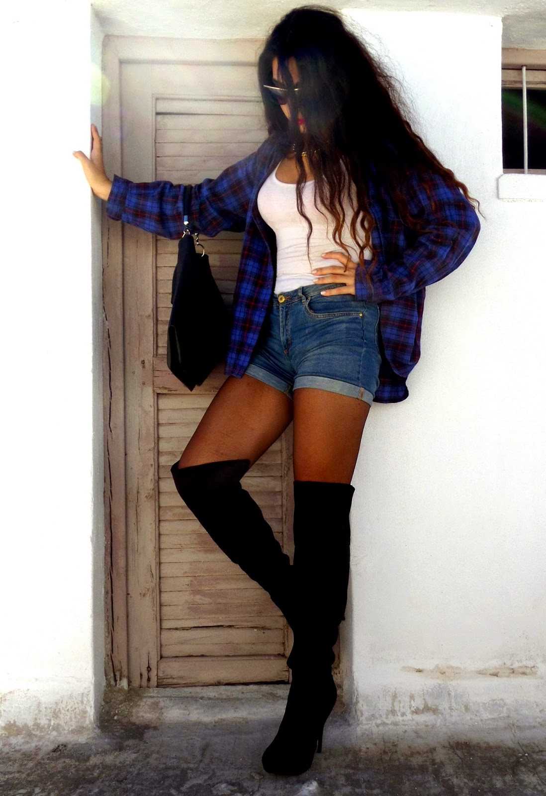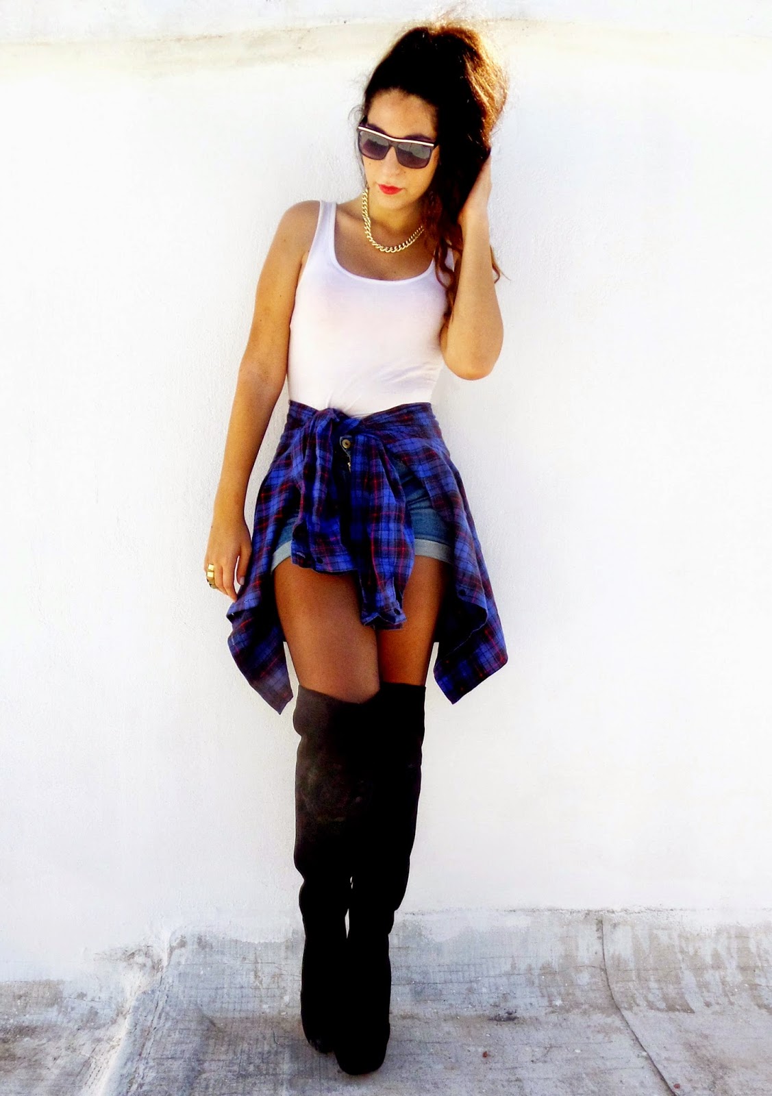 Hello αγαπημένες μου Fashionistas! Ο Φθινοπωρινός καιρός μπορεί να μας μπερδεύει, μας δίνει όμως τη δυνατότητα να αναμείξουμε κομμάτια από την καλοκαιρινή και την χειμερινή μας γκαρνταρόμπα. Για το συγκεκριμένο outfit, επέλεξα πολύ απλά και basic κομμάτια και τα συνδύασα με τις αγαπημένες μου (που πλέον θα έχετε βαρεθεί να βλέπετε :P), over-the-knee μπότες και ένα καρό πουκάμισο! Το αποτέλεσμα είναι ένα grungy, edgy outfit τέλειο για μια έξοδο με τα κορίτσια… Το καρό αποτελεί τάση καιρό τώρα και αποτελεί προσωπικό μου αγαπημένο. Oσο για τα αξεσουάρ, πρέπει να πω… Το χρυσό δεν είναι καθόλου ψυχρό! Επέλεξα χρυσά αξεσουάρ που έδωσαν στο outfit την glam πινελιά που χρειαζόταν. Ελπίζω να σας αρέσει. Περιμένω τα σχόλια σας!