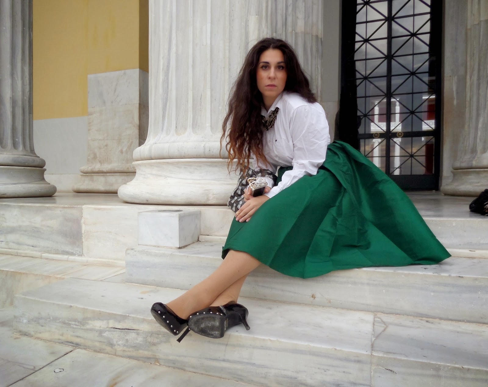This week I’m taking notes from Gossip Girl’s, Miss Blair Waldorf and I’m giving you a look with a vintage, old school feeling (the only thing missing is a headband!). I paired this beautiful, rich emerald green, bell skirt with a simple shirt and some glamorous accessories! This skirt made me feel so nostalgic and romantic. It was a beautiful trip to another era. You see, sometimes, we need a little reminder of what true femininity really stands for. Which is class, elegance and attitude! As for the accessories, my favorite one is this fabulous, Chanel No5 bottle inspired, iPhone case. It was love at first sight and I really think it matches perfectly with this outfit. Never forget Coco Chanel’s quote: ‘’A girl should be two things, classy and fabulous’’.