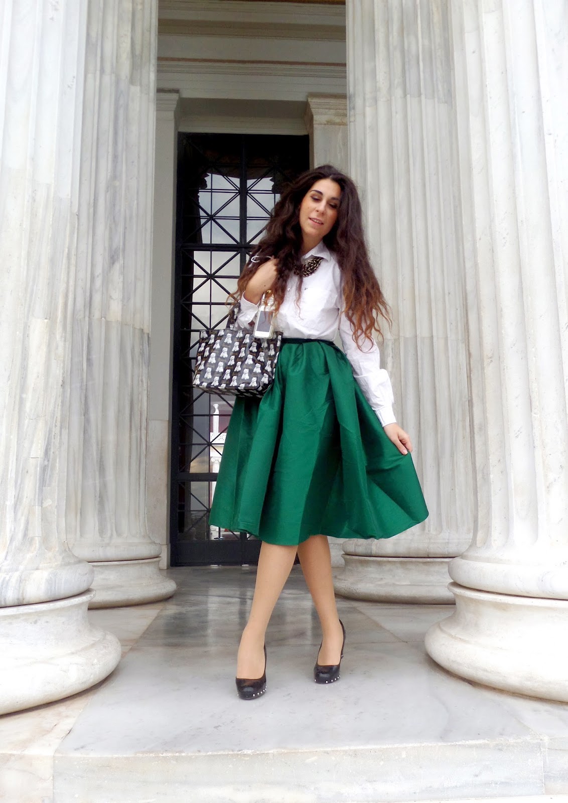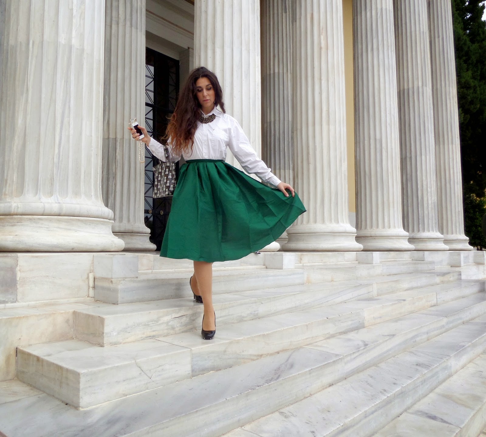 Αυτή την εβδομάδα ακολουθώ τα βήματα της Δεσποινίδας Blair Waldorf του Gossip Girl και σας παραδίδω ένα outfit γεμάτο old school και vintage αέρα (το μόνο που λείπει από το σύνολο είναι μια στέκα!). Συνδύασα λοιπόν, αυτή την υπέροχη, φούστα-καμπάνα σε χρώμα βαθύ πράσινο του σμαραγδιού με ένα απλό πουκάμισο και μερικά λαμπερά αξεσουάρ! Αυτή η φούστα με έκανε να νοιώσω τόσο νοσταλγικά και ρομαντικά. Ήταν ένα πανέμορφο ταξίδι σε παλιότερες εποχές. Βλέπετε, μερικές φορές, χρειαζόμαστε μια μικρή υπενθύμιση για το τι σημαίνει πραγματική θηλυκότητα. Δηλαδή class, κομψότητα και attitude! Όσο για τα αξεσουάρ, το αγαπημένο μου είναι αυτή η φοβερή θήκη iPhone, που είναι εμπνευσμένη από το μπουκάλι του αρώματος Chanel No5. Την ερωτεύθηκα μόλις την είδα και πραγματικά πιστεύω ότι ταιριάζει τέλεια με το συγκεκριμένο outfit. Μην ξεχνάτε ποτέ το quote της Coco Chanel: ‘’Ένα κορίτσι πρέπει να είναι δύο πράγματα, κομψό και υπέροχο’’.