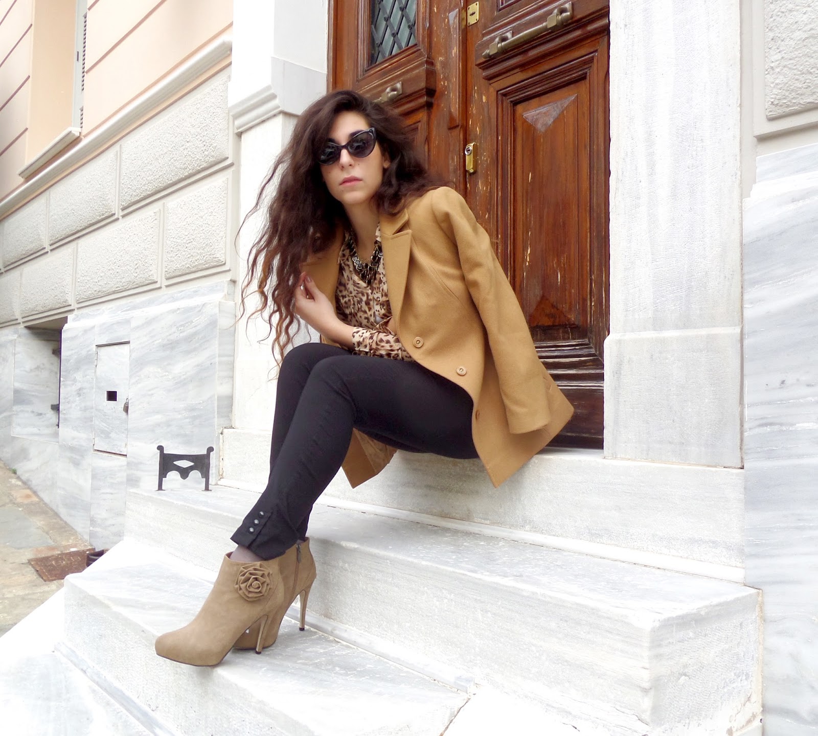 Όπως ήδη γνωρίζετε, είμαι μεγάλη οπαδός της ανάμειξης μοντέρνων και κλασσικών κομματιών... Αυτή τη φορά επέλεξα ένα πολύ κλασσικό look με ένα μαύρο, απλό παντελόνι και ένα καμηλό παλτό. Τα λεγόμενα camel coats είναι ένα από τα πιο κλασσικά outwear κομμάτια και αυτή τη σεζόν επανέρχονται στο προσκήνιο δυναμικά! Αρχίστε λοιπόν την ανασκαφή στις ντουλάπες σας καθώς είμαι σίγουρη ότι έχετε ένα (κι αν όχι εσείς, η μητέρα σας έχει ένα σίγουρα). Για να δώσω λίγη περισσότερη ζωντάνια στο σύνολο, επέλεξα να φορέσω ένα leopard print πουκάμισο. Τα animal prints αποτελούν επίσης μια από τις μεγαλύτερες τάσεις της φετινής σεζόν, θα σας συμβούλευα βέβαια να τα φορέσετε με μέτρο. Σε μεγάλες δώσεις θα σας κάνει να μοιάζετε σαν να επέστρεψε το βράδυ του Halloween! Ένα η δυο κομμάτια ωστόσο, μπορούν να προσθέσουν μια edgy νότα σε ένα κλασσικό outfit. Έδωσα επίσης έναν αέρα λάμψης του παλιού Hollywood με τα cat-eye γυαλιά μου, τα οποία πραγματικά ερωτεύομαι! Μη φοβάστε πότε να