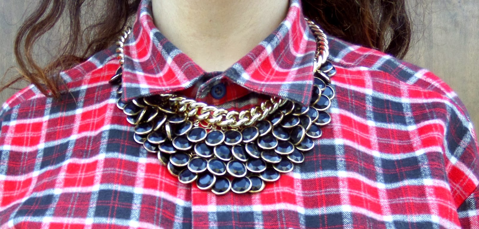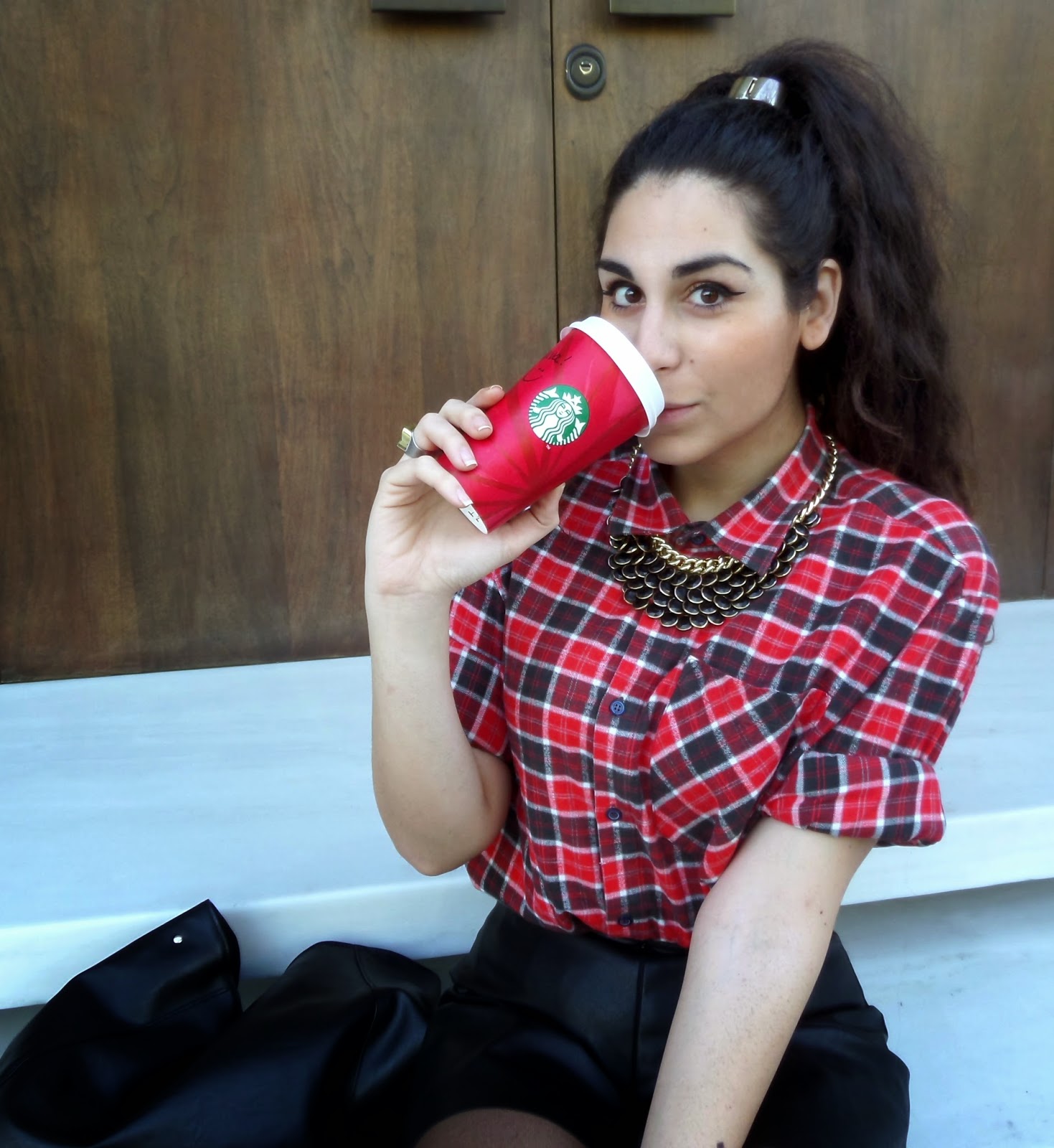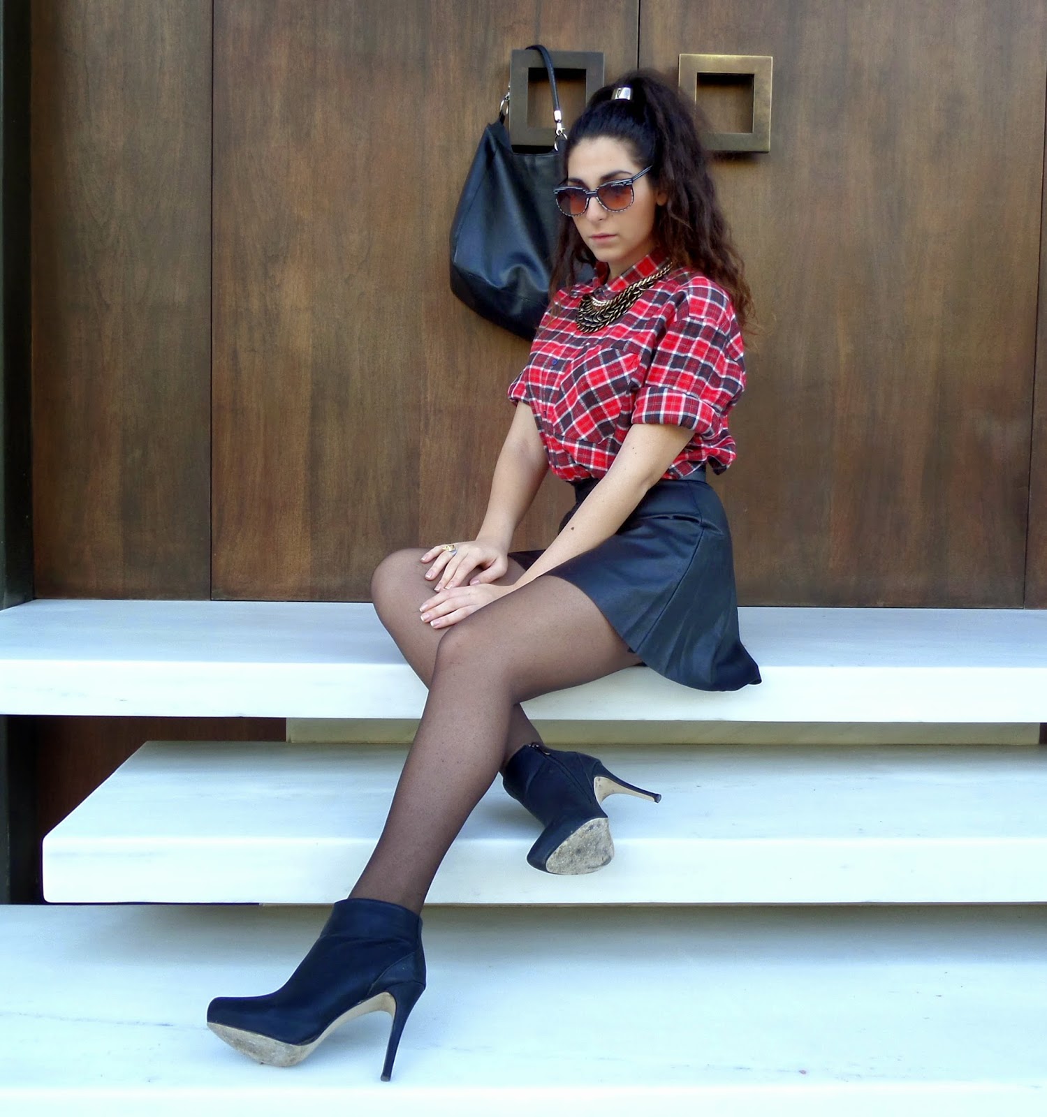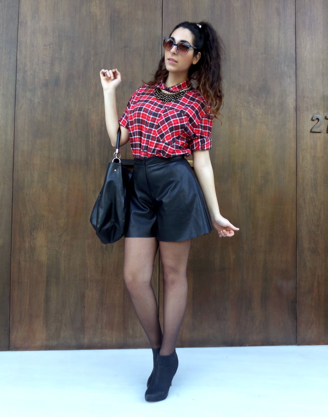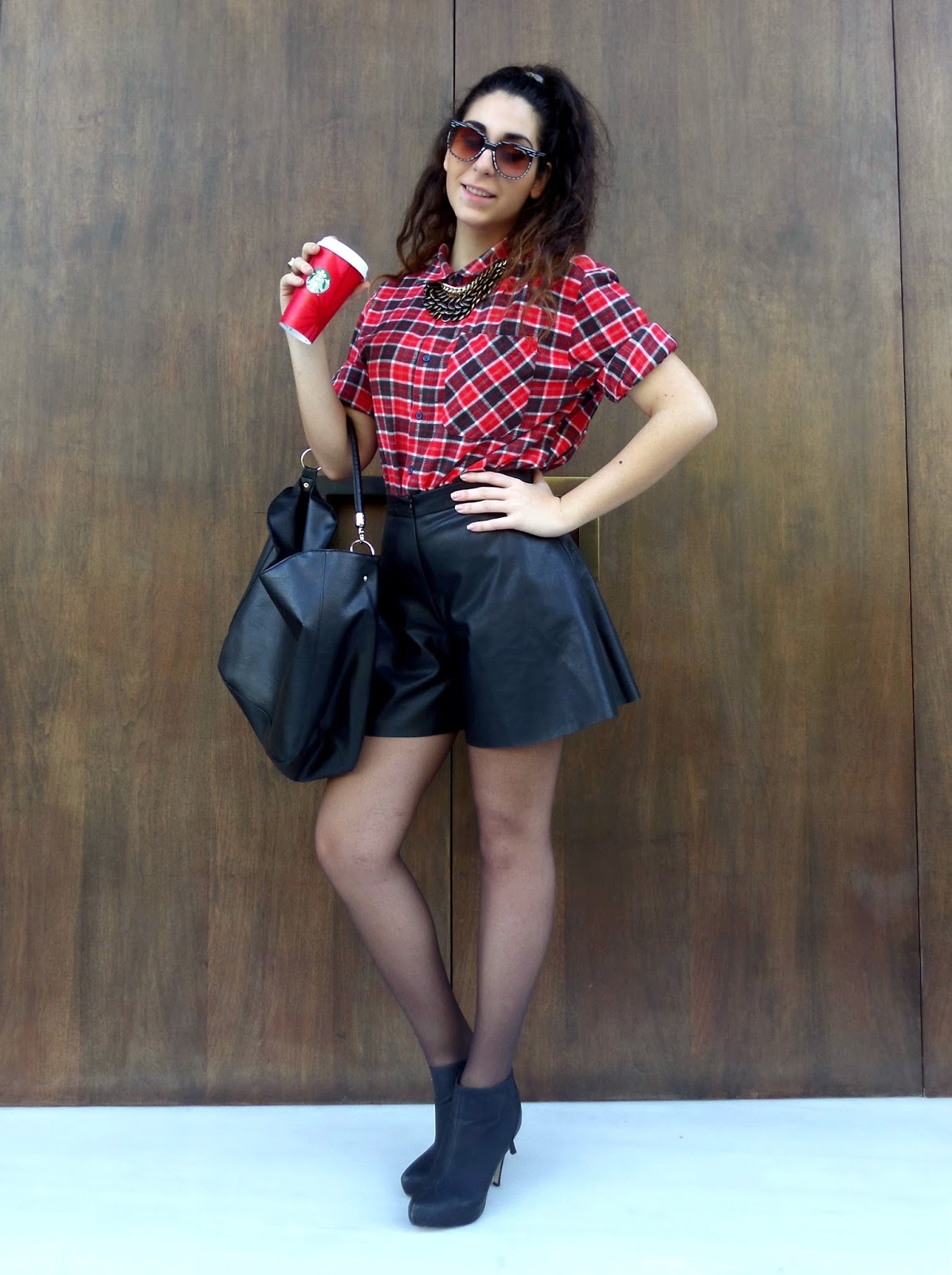 Το καρό και το δέρμα αποτελούν δυο από τα πιο hot trends αυτής της σεζόν και για αυτό τα συνδύασα για το post αυτής της εβδομάδας! Επέλεξα να φορέσω ένα skort (σορτσάκι και φούστα), το οποίο δίνει τη χάρη της φούστας στο ντύσιμο σου, ενώ έχεις τα προνόμια που έχουν τα shorts. Είναι πολύ βολικά και δεν χρειάζεται να προσέχεις και να ανησυχείς όλη την ώρα για αποκαλύψεις που μπορεί να σε φέρουν σε δύσκολη θέση! Το κόκκινο καρό πουκάμισο σε συνδυασμό με τα μαύρα αξεσουάρ έδωσαν έναν edgy αέρα, ενώ τα κοσμήματα σε τόνους του χρυσού και του μαύρου πρόσθεσαν το glamour που χρειαζόταν το σύνολο. Είναι σχεδόν Χριστούγεννα άλλωστε και όλοι θέλουμε λίγη λάμψη! Είναι ένα τέλειο outfit για night out ή για μια βόλτα στη πόλη, αν αντικαταστήσεις τα τακούνια με biker boots...