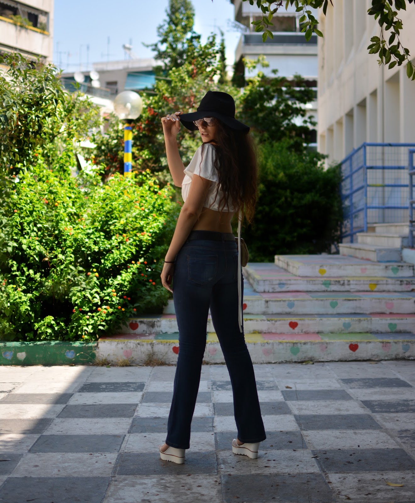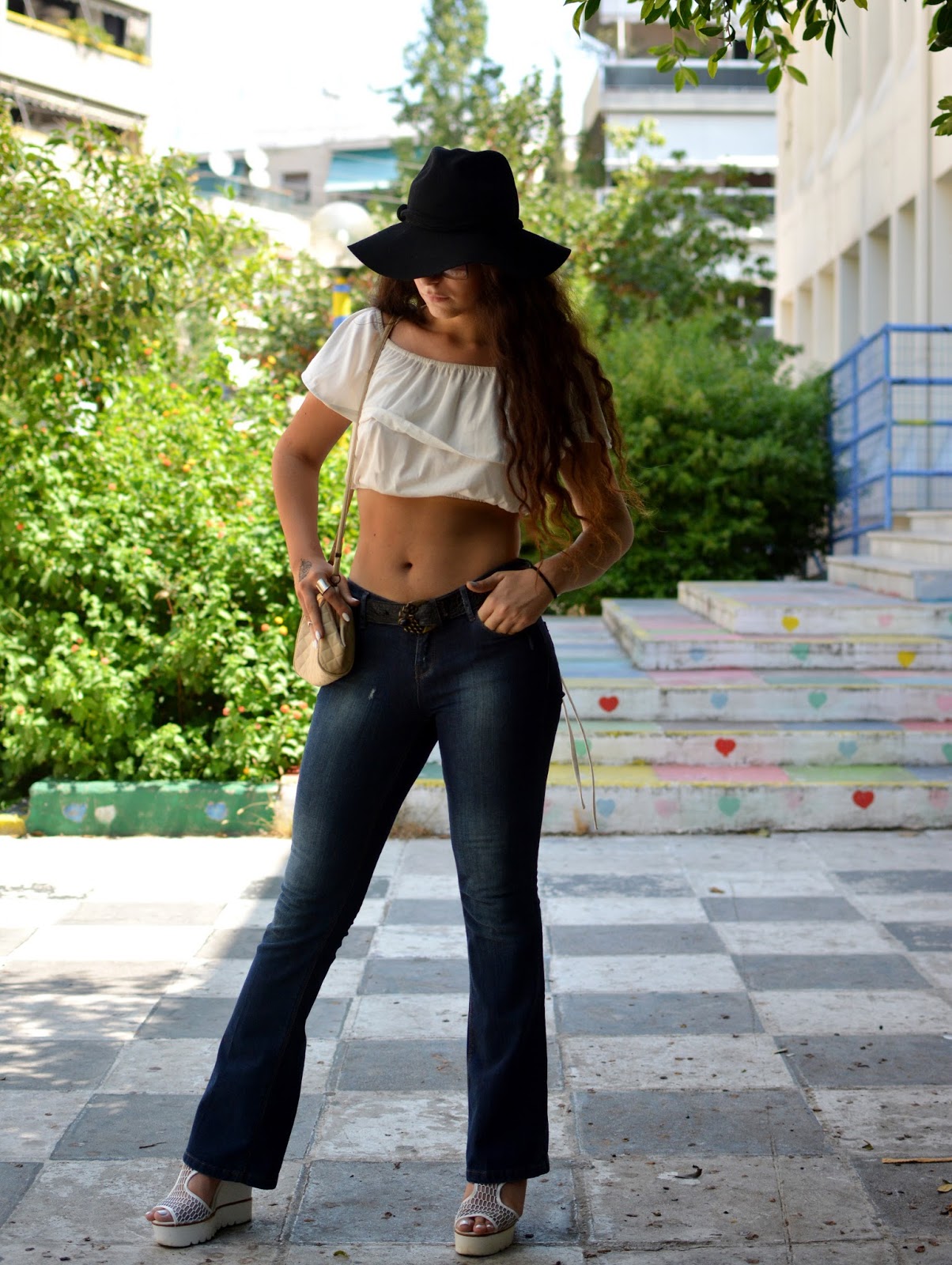 I think the best combination for flared jeans is a off-the-shoulder top, wedges and a hat so yeah, you did it all right ;) Also loving these cool and sporty shoes!
