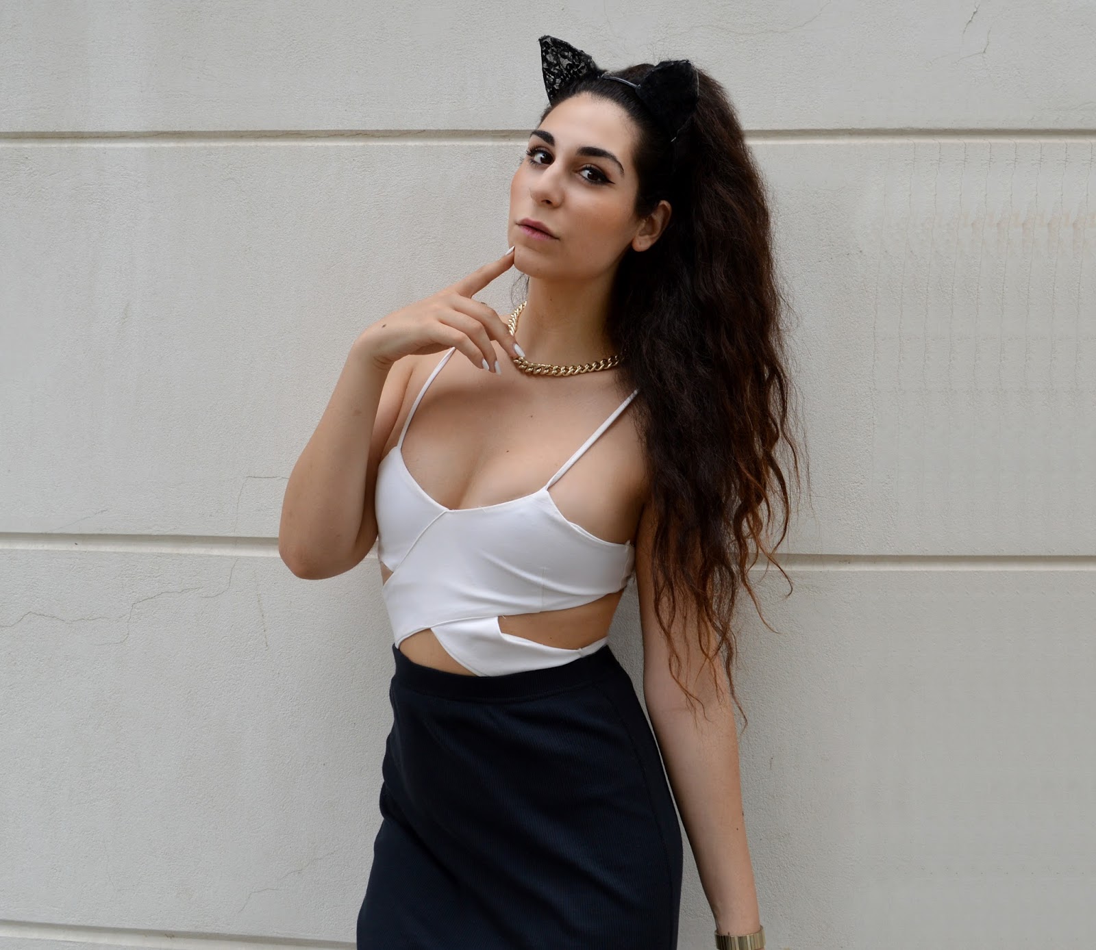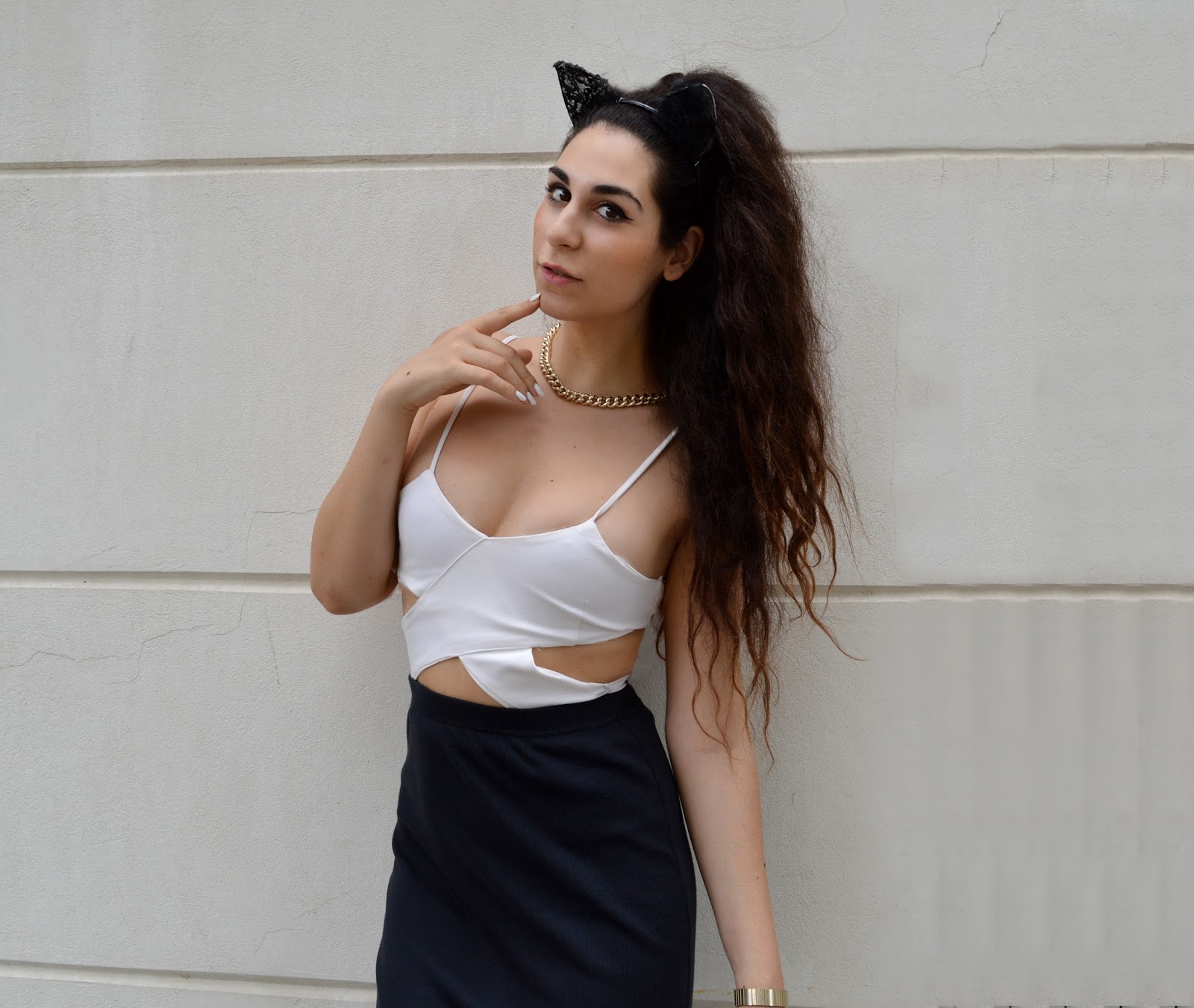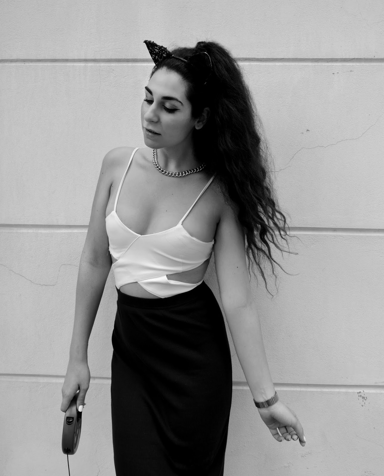 Hello Fashionistas! I maybe a CatWoman but I'm also a dog person... In fact I believe that cat is my spirit animal but I adore dogs... And here's hard proof that cats and dogs can definitely be besties! In this post my co-star is the sweet and feisty, Charlie, who is my co-blogger Maria's dog, and I love him! We had a wonderful walk together and it was so much fun! As for my outfit, I'm loving body hugging silhouettes lately so I wore my long, pencil skirt and a white, cut-out crop top. I also wore my fav cat ears! I love wearing them, even though some people might think I'm crazy, but really... Who cares? When they became a thing with pop-stars, such as Ariana Grande and Taylor Swift rocking them, I was so excited! I even have a DIY tutorial for them! Let me know what you think about the look and never be afraid to be bold and try fun, new things (such as cat-ears obviously) no matter what people think or say... Just be your wonderful selves! Meow!