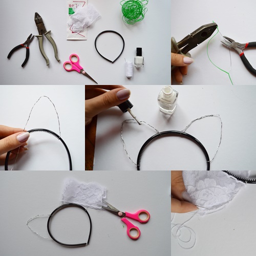 1. You'll need white, lace ribbon, wrapping wire, black headband, scissors, white nail polish and two pliers!