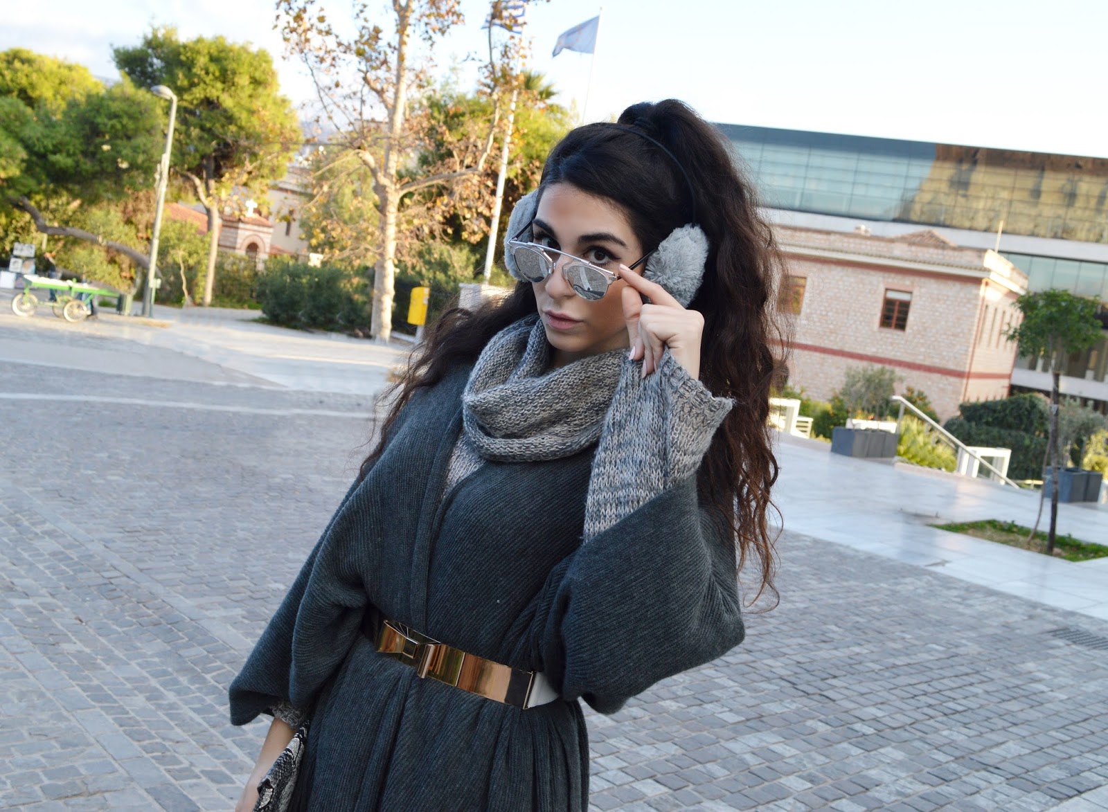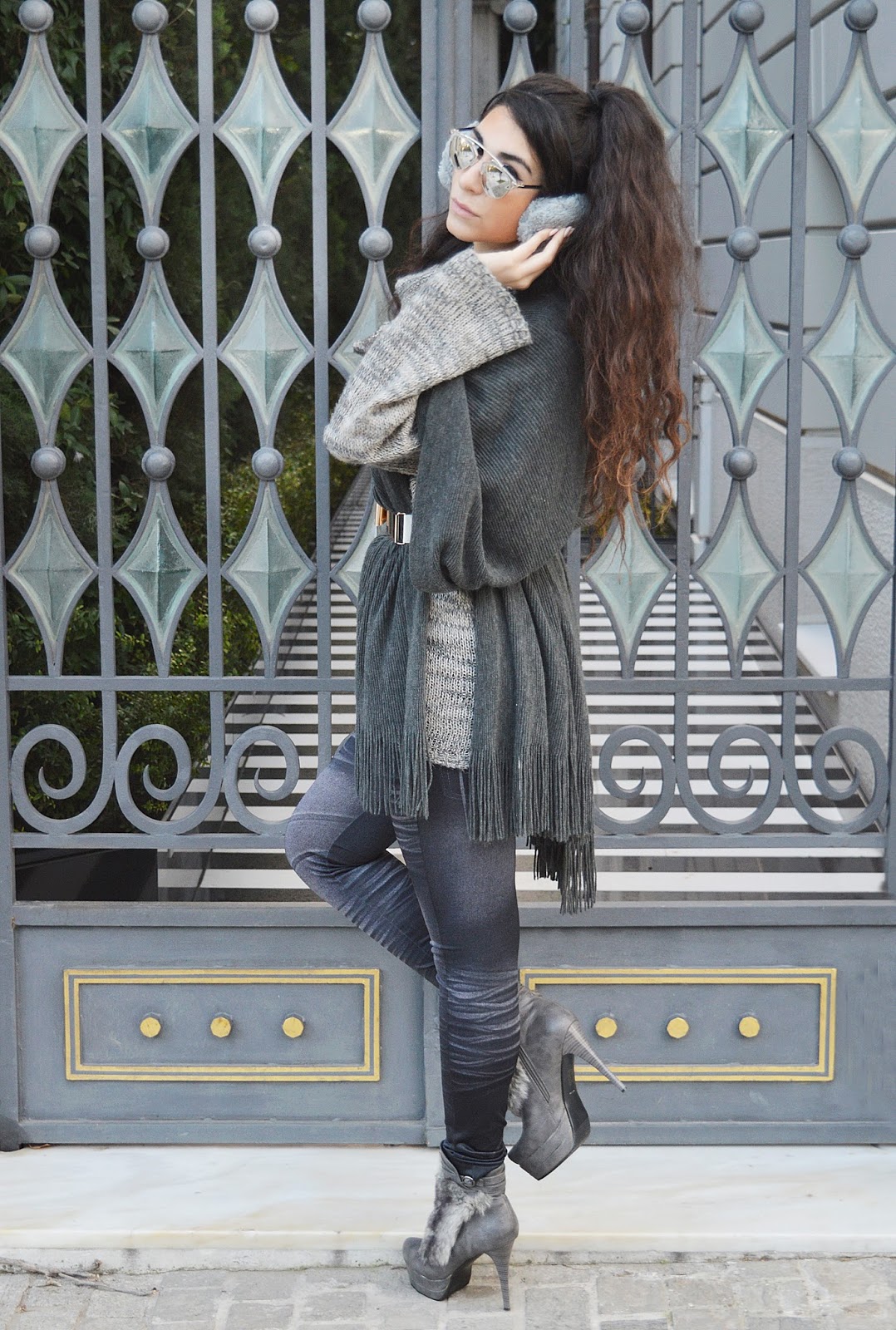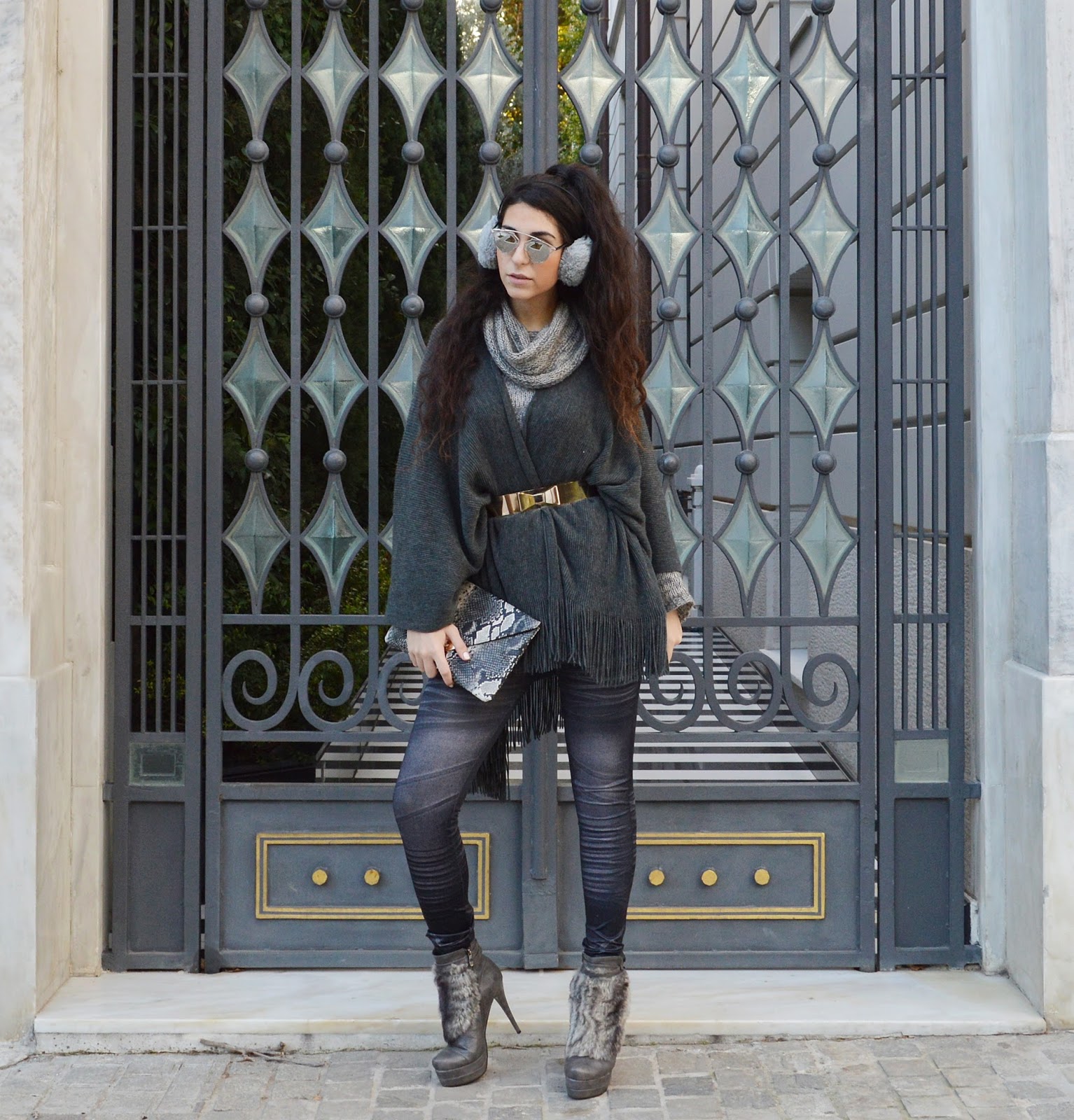 Hello babes! Since this is my third total grey outfit, I couldn't think of a better title than this one... The weather is getting seriously colder and I, as per usual, have a cold! Shocker, I know... Today's outfit is all about looking cute, while freezing! Thank god for capes and earmuffs... I seriously feel like the Ice Queen! Capes are the perfect choice for this Winter and it's a plus if they are fringed... Obviously! I'm also loving mirror accessories for that ''frozen'' vibe... My sunglasses from Dressin are one of my fav items on this look while my mirrored belt from Newress is a great way to accentuate your waist... I mean, who said that winter wear should eliminate your feminine silhouette, right? Christmas feels so close and it's time for walks around the lighted city! Create your perfect, warm and cosy outfit and get out there... Ice skating, hot chocolate, X-mas shopping, you choose! Whatever you do, stay safe, have fun and embrace the love!