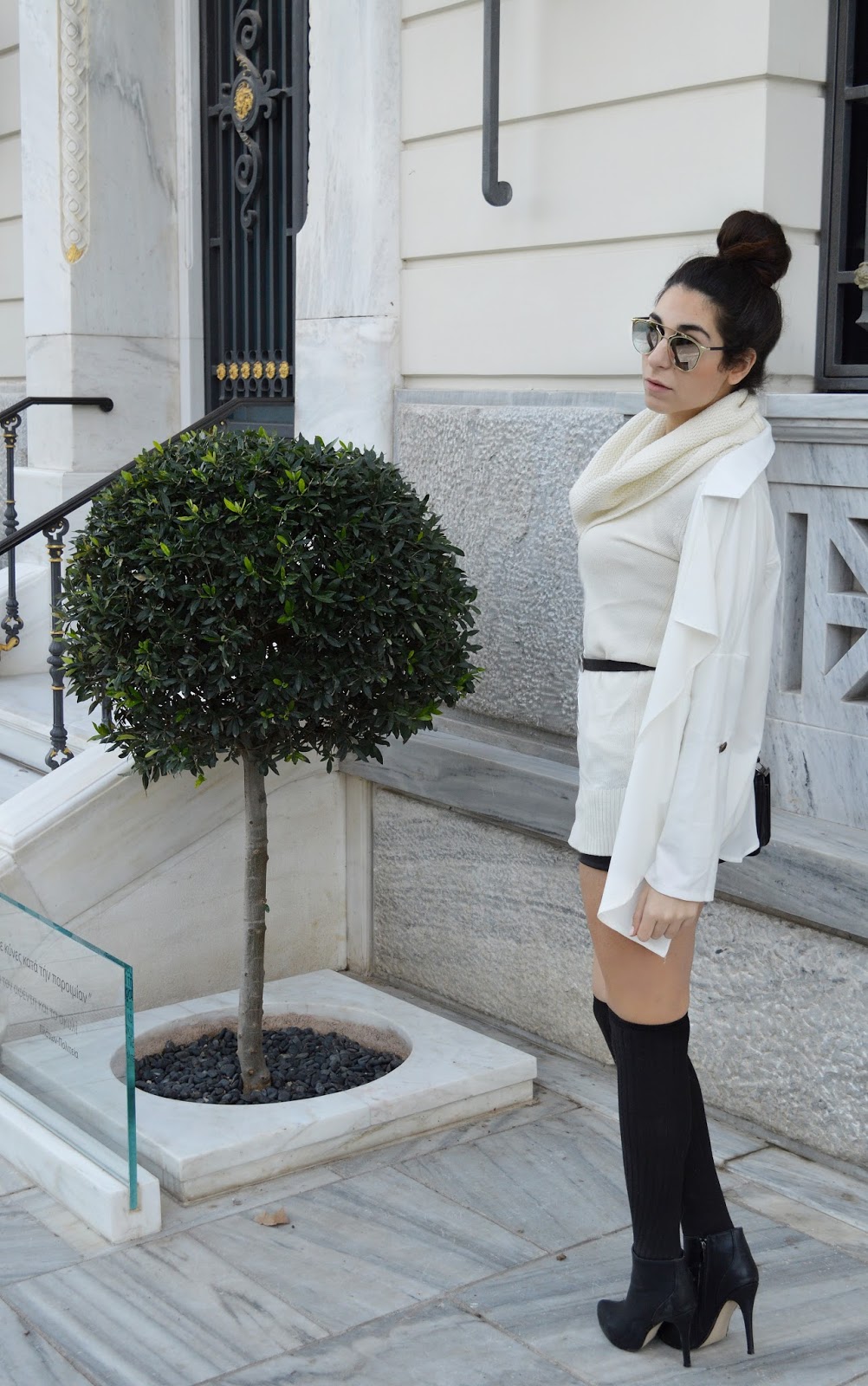 Hello Fashionistas! Δεν μπορώ να πιστέψω ότι τα Χριστούγεννα έχουν σχεδόν φτάσει! Ο χρόνος πετάει... Στο σημερινό post φοράω λευκό και μαύρο, ένας συνδυασμός που δεν είναι ποτέ λάθος (σε περίπτωση που έσπαγες το κεφάλι σου σχετικά με το τι να φορέσεις αύριο!). Είμαι πολύ ενθουσιασμένη γιατί φέτος το Χειμώνα οτιδήποτε είναι over-the-knee έχει την τιμητική του! Μπότες και κάλτσες είναι ο τέλειος τρόπος για να παραμείνεις ζεστή και stylish! Παρόλα αυτά, αν το τελευταίο hot ζευγάρι thigh-high μπότες που είδες είναι πανάκριβες σου έχω μια εναλλακτική! Απλά φόρεσε τα ankle boots σου με κάλτσες o-t-k του ίδιου χρώματος! Πρακτικό, στυλάτο και οικονομικό! Επίσης, αν θέλεις να προσθέσεις μια chic πινελιά στο look σου, ένα απλό coat σαν το δικό μου από το NewDress είναι ακριβώς αυτό που χρειάζεσαι για να το συμπληρώσεις! Έτοιμη να περάσεις σούπερ λοιπόν; Τα Χριστούγεννα είναι εδώ και είναι ώρα να ξεχάσουμε προβλήματα και έγνοιες, να αναπνεύσουμε το γιορτινό κλίμα, να περάσουμε χρόνο με τους αγαπημένους μας ανθρώπους και να δημιουργήσουμε όμορφες στιγμές! Ότι κι αν κάνεις να ζήσεις στον απόλυτο βαθμό την κάθε στιγμή! Καλά Χριστούγεννα babes!