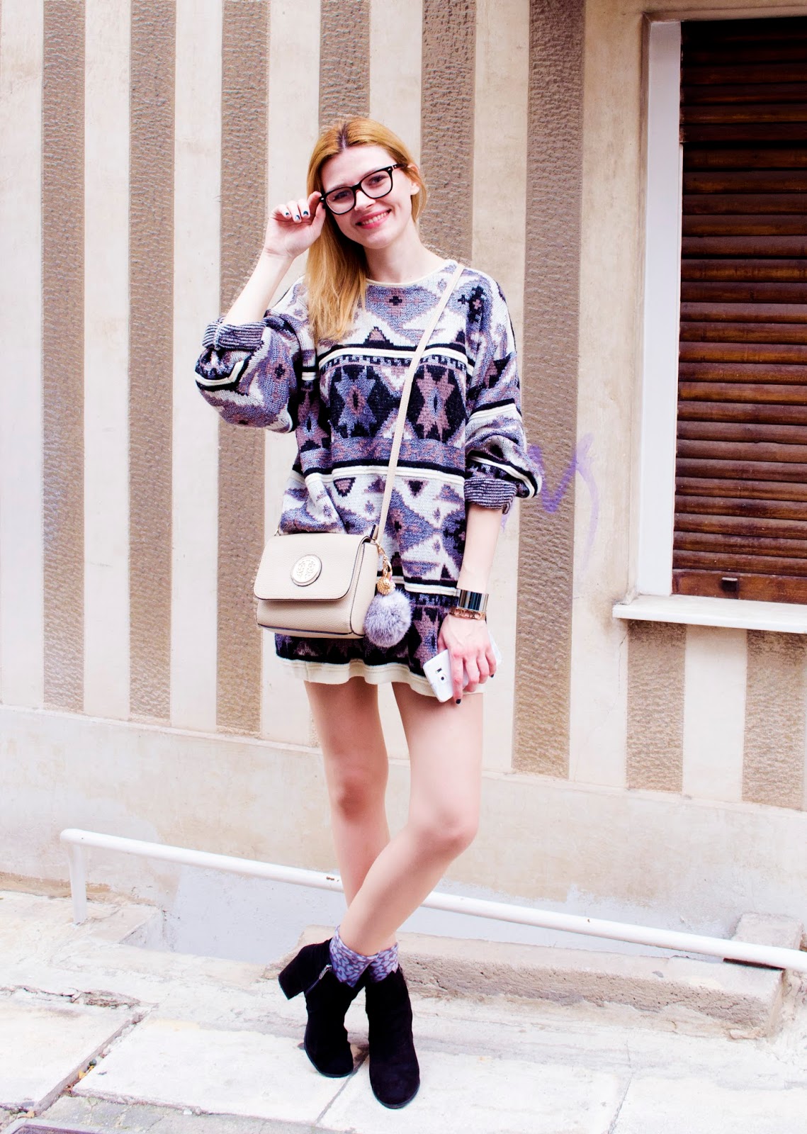 The sweater is amazing! Loving the glasses and the boots are very cool!
