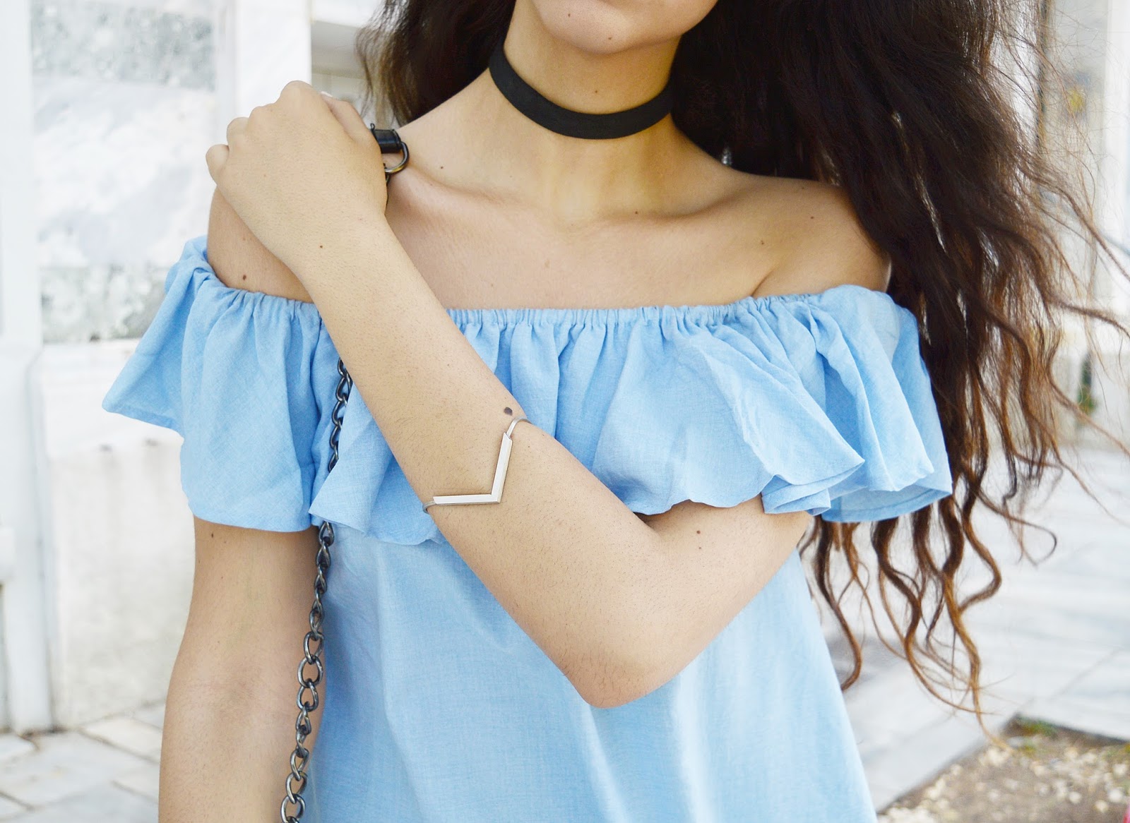 Hello Fashionistas! In today’s post I’m showing you my favorite ‘’Smart’’ dress… And what a smart dress might be, you’re going to ask me! And I’m going to answer, by saying that a smart dress is a dress that you can pretty much wear with anything and go everywhere! I dressed up mine a little bit, but you could just as well wear it with sneakers! My beautiful, baby-blue, off-shoulder dress is by Choies! In the website you can find this and a ton of other on-trend designs in amazing prices… I’m in love with the off-shoulder trend and lately I’ve been wearing this baby all the time! I tried to keep the accessorizing as minimal as I possibly could! As for jewelry I chose my fav black, ribbon choker and this gorgeous, silver, bracelet… I discovered this beautiful piece on Ashleigh Amber Moore Jewelry, a paradise for modern and minimal designs, which the lovers of the kind will adore! I’m not a huge fun of minimal myself, but I loved the sharp and elegant designs… Definitely check it out! Looking forward to reading all of your comments regarding this look… Until next time, have fun and be ‘’smart’’!