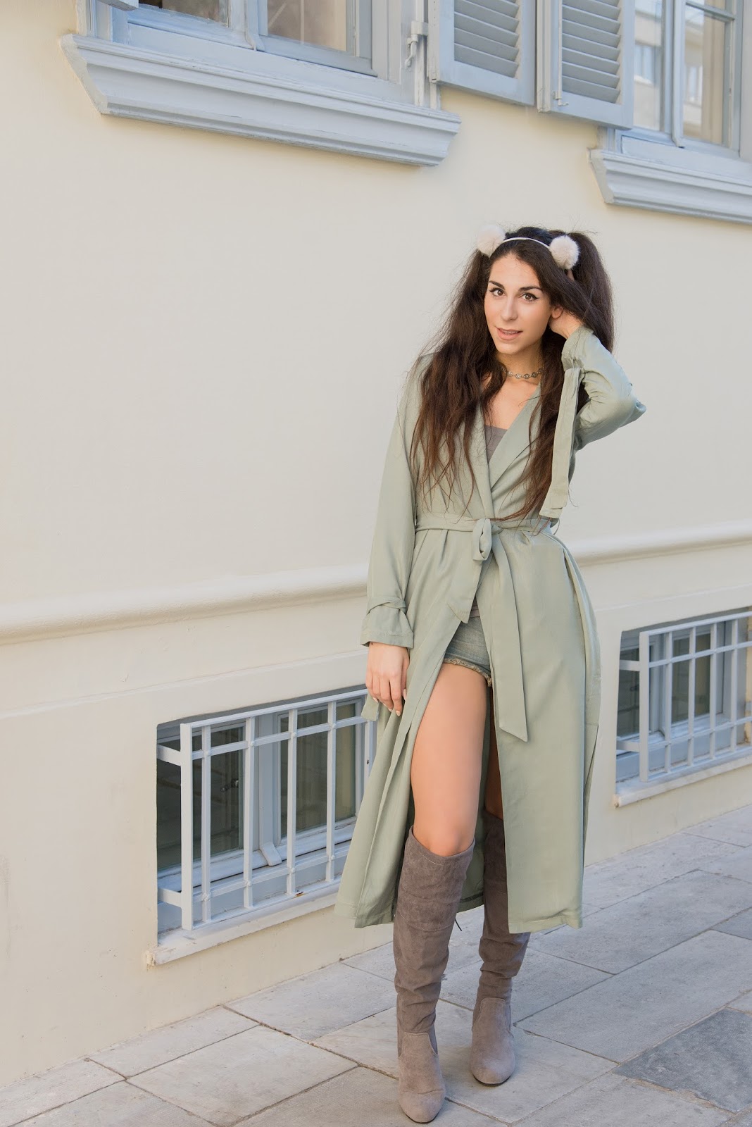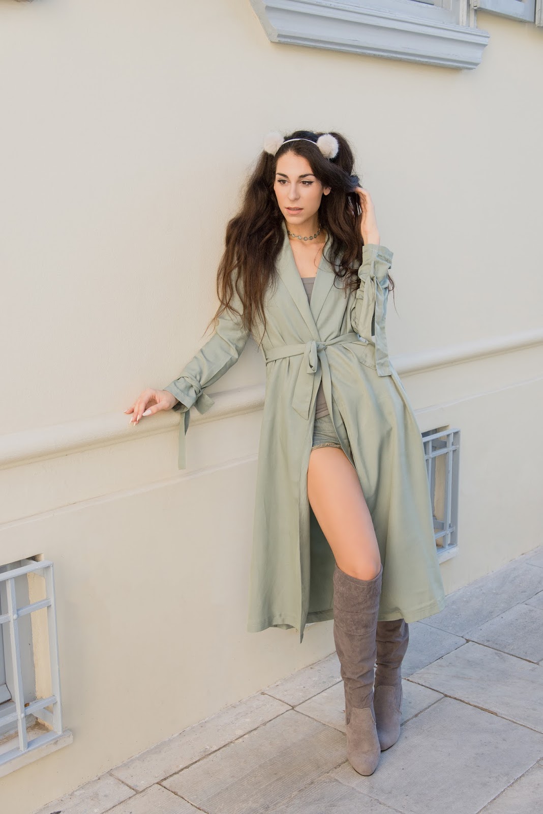 It’s clearly trench-coat weather and I’m loving the look and feel this one gives me… I chose this fluid trench-coat in dusty green, or as I call it peppermint green, by NA-KD.com and I love it, it really flows when you wear it and gives a sophisticated vibe to any look! If you love it as much as I do, you can have it –or anything else form the website- with 20% by using the code MARINAFASHIONISTA20 while doing your shopping! Oh! And everything comes with free worldwide shipping! They offer all the latest fashion in high quality and style… So yayy for that! I paired this amazing piece with my fabulous new grey, suede boots by Chic Me, another web-store I really love! The trench-coat and boots combo is a classic and simply BOMB!! Needless to say I’m in love with these boots and I’m gonna be wearing them a lot this winter… OMG! Winter… No, not just yet! This look is simple and chic… but I felt it needed some extra sass, so I added a mouse, faux fur headband… Because… Of course I would!! The amazing photos are once again shot by the talented Achilleas Vogdanidis of Vogdanidis & Sons Photography-Cinematography and I just love them… He gets my vibe completely and helps me out in creating an amazing, dreamy result! If you want to capture your own dream moments (weddings, christenings, family moments, events etc.) head out to the website and enter the fairytale! I hope you liked my new, Fall look and I can’t wait to read your comments down below… Until next time, stay cool, happy and Fresh!