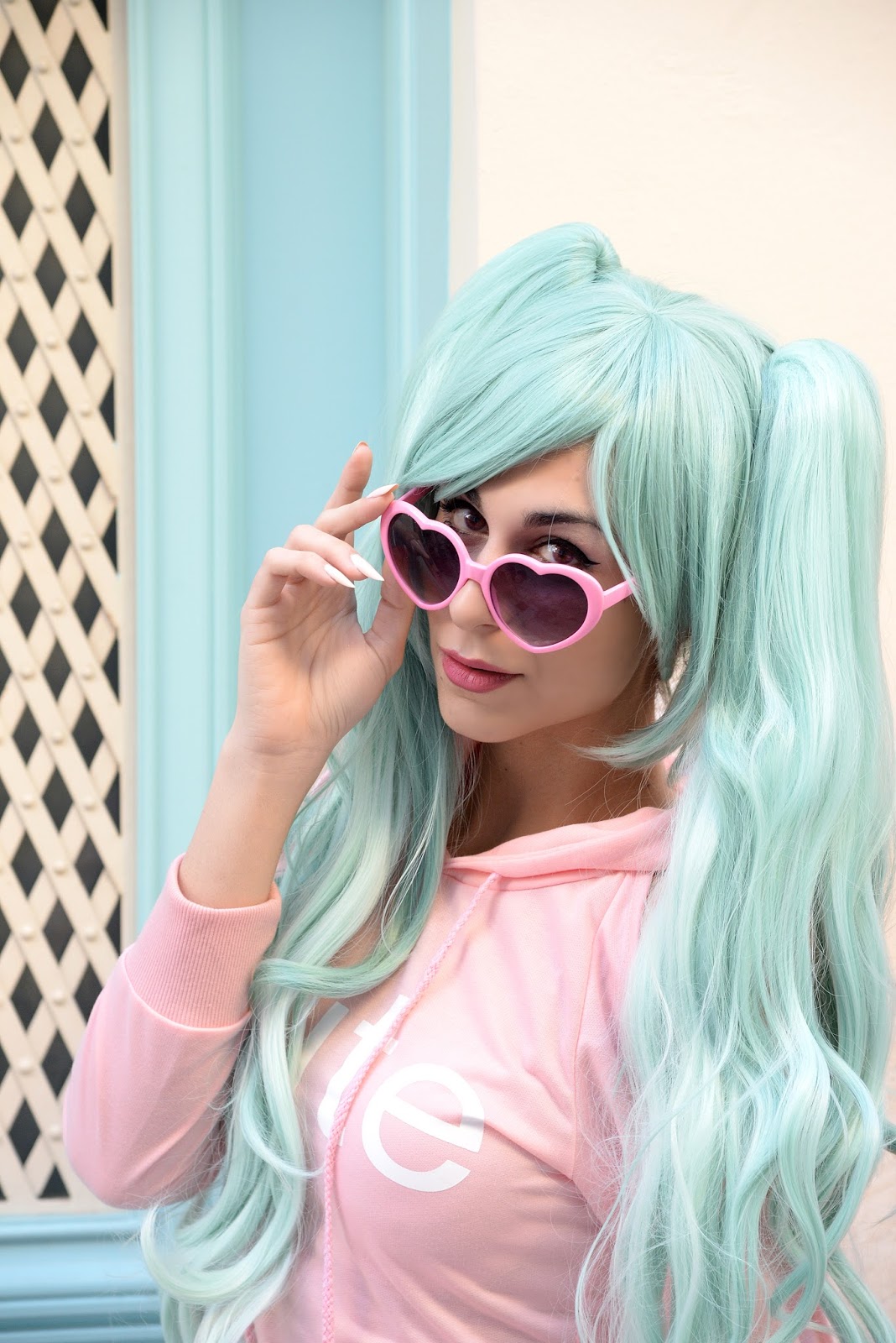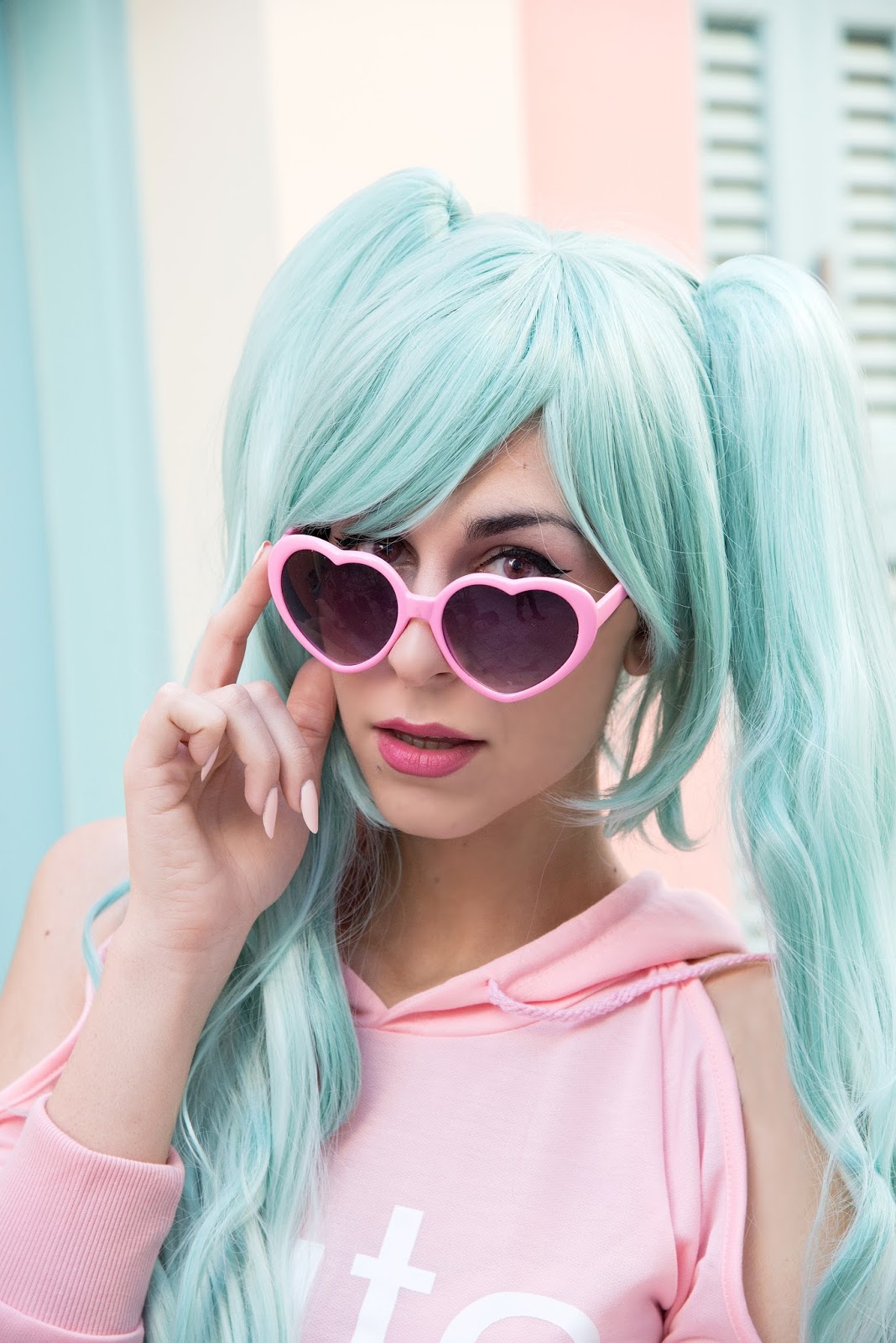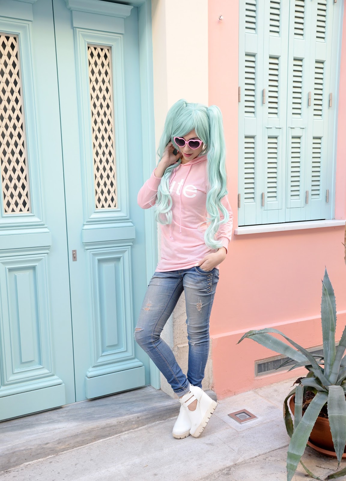 How cute is this look, right?? I’m usually not the one to go sporty, but this cute Hollow Out Hoodie Dress stole my heart forever… I wore it as a top because *cold* but I loved it so much and the open shoulders just gave the whole look a frisky touch! I spotted it at www.lupsona.com, where you can find amazing sporty and sexy pieces in unbelievable prices… The rest of my outfit is pretty basic and simple for me, but I love it for everyday! Of course I had to make it extra… Let’s talk about my new wig! I’m in love with my Vocaloid Hatsune Miku Wig! It is for cosplay based on a manga character, however I used it as part of the look, since you know it’s mint and cute and has pigtails! Hihi!! You all know how much I rely on wigs lately for trying different looks… So, if you are ready for a fun change too visit StarLight Wigs for more cosplay, lace-front and simple wigs of amazing quality and affordable prices! I’m also loving changing contact lenses, so this time I’m wearing my new O-Lenses Caribe Con- Pinkcircle lenses… They are a bit more subtle than the ones I’ve tried before and they accentuate my brown eyes by giving them a more natural, pink-ish hue! I’m really digging the look! For more circle lenses you can click on PINKICON. I loved the mint-pink combo of this look and as you can clearly see, I’m totally matching my background… the whole thing was really random but I loved, loved, loved the result! Responsible for that result is, once more, Achilleas Vogdanidis of Vogdanidis & Sons Photography- Cinematography! I’m so thankful for the cute, bright and dreamy photos he once more provided for me… If you’d like to capture your special, colorful and magical moments such as weddings, christenings, family occasions, events etc. Click on www.vogdanidis.com and make your moments last forever! Btw, let me tell you, people were passing by all the time, asking for pictures with us and asking us what we were shooting for… It was a bit cute, but surreal as well… hihi!! I hope you liked my look and until next time, be pink, be you, be CUTE!!