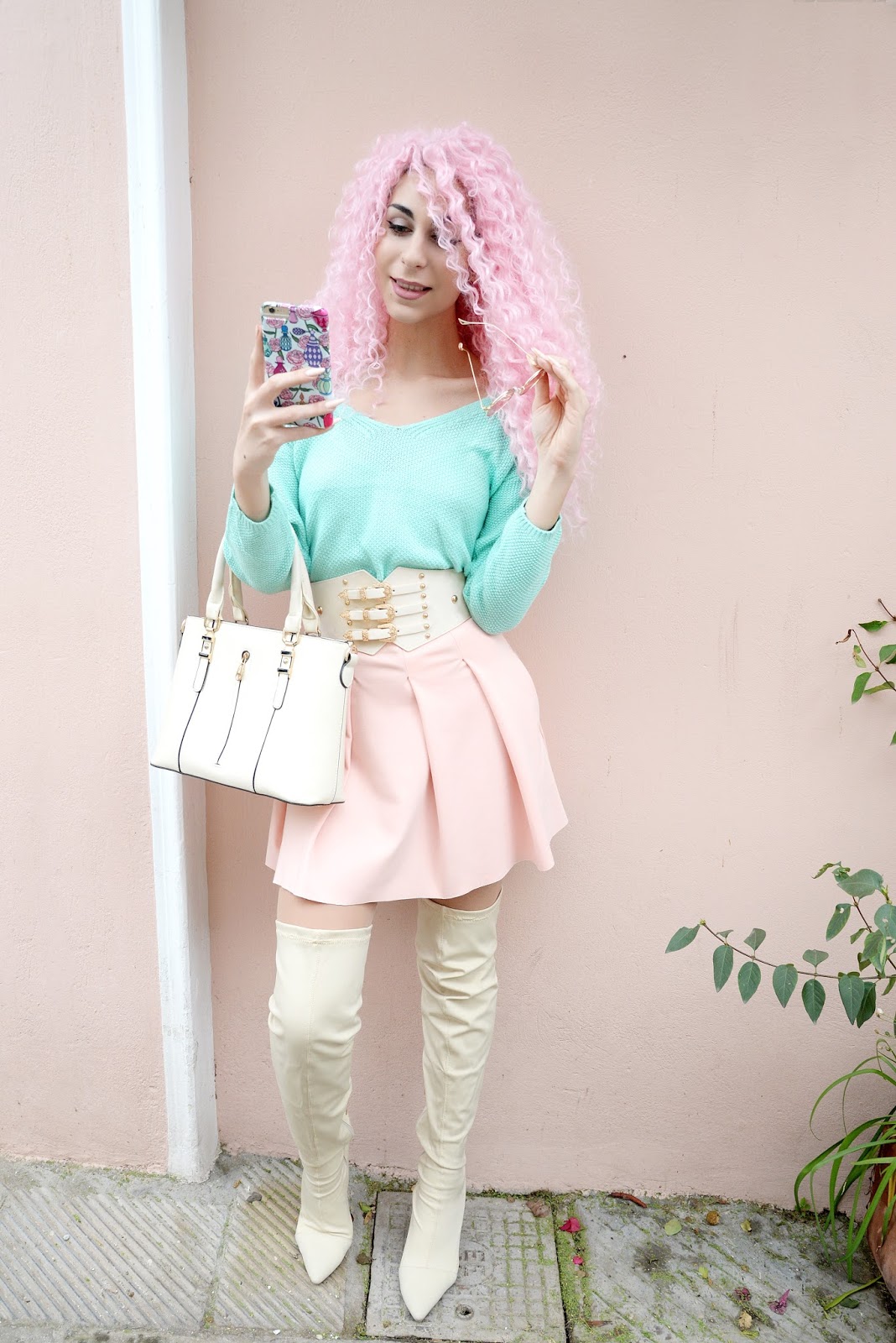 Ahh the 80s… What a sparking, colorful time! My outfit this time is full of pastel colors that I love… With my amazingly cute, mint sweater by DRESSWEL (Use the code ''CODE25'' on www.dresswel.com for 25% off) and paired with a pink pleated skirt and a corset-like belt I got from ROSEGAL… I love these belts since they can elevate any outfit, as well as accentuate the waistline amazingly! However the most 80’s thing is the hair… Oh the 80’s was all about big hair, perms and everything flashy! This Pink Lace Front wig by Rosegal had me feeling all groovy and fun… I loved bouncing up and down to check the body of it all! Completing my look is this amazing pair of funky sunglasses I spotted on ZAFUL… They actually do remind me a bit of the 70s, but the colors were matching so perfectly with the rest of my look! As I always say, our phones are part of our get-up these days and I’m obsessed with transforming mine with different, fun cases… My latest fav case is a work of Hilary, who’s the owner of the HENNA By HILARY brand! She is really talented and her designs never fail to impress me… I was gagging over my case when I saw it! The colors are just so vibrant and the print is so girly and… ME!! The amazing photos of this post, were once again taken by Achilleas Vogdanidis of Vogdanidis and Sons Photography- Cinematography! I’m living for them and I’m always so happy to be working with him, since he gets my vibe and helps me in creating the best result possible on each post… If you want your special moments, such as weddings, christenings, family occasions, events etc. captured with great artistry, head to www.vogdanidis.com! Everyday problems, can many times make us feel down and blue, but it’s all about turning to crazy colors and bold choices in order to forget about them… So until next time, get your groove on, be bold, have fun and never forget… The Groove is The Solution!
