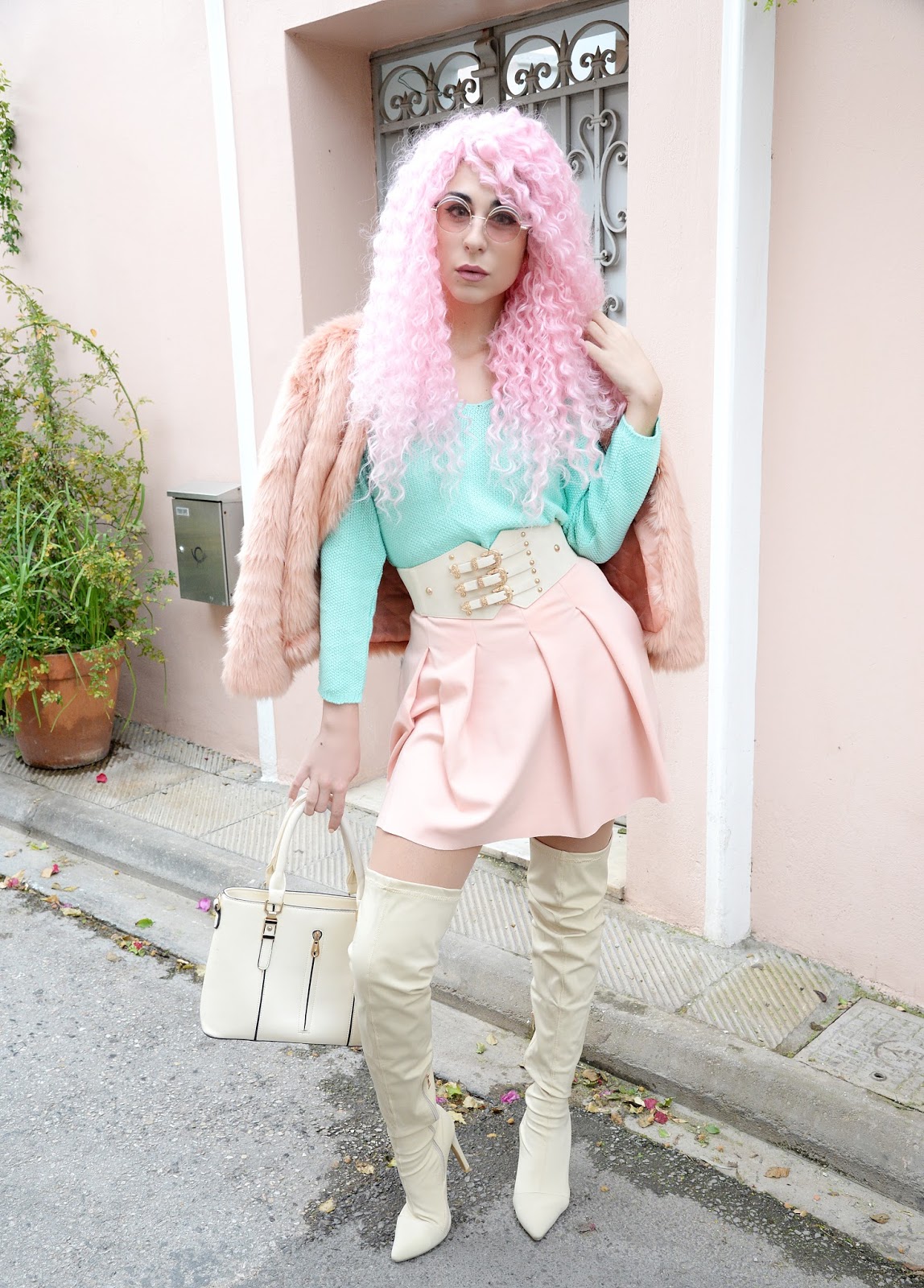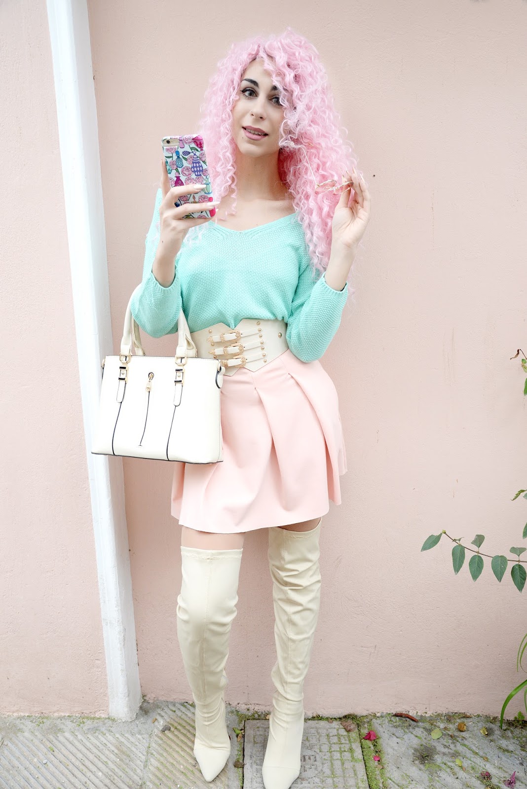 Ααα τα 80s... Τι λαμπερή, πολύχρωμη εποχή! Το outfit μου αυτή τη φορά είναι γεμάτο με τα pastel χρώματα που αγαπώ... Με το υπέροχα χαριτωμένο μου, mint sweater από το DRESSWEL (Χρησιμοποιήστε τον κωδικό ''CODE25'' on www.dresswel.com για 25% έκπτωση) σε συνδυασμό με την ροζ, φούστα μου με τις πιέτες και τη ζώνη που θυμίζει κορσέ, την οποία βρήκα στο ROSEGAL… Αγαπώ αυτές τις ζώνες μιας και μπορούν να αναβαθμίσουν κάθε σύνολο, καθώς και να τονίσουν φοβερά τη μέση! Παρόλα αυτά, το πιο 80s πράγμα του look είναι τα μαλλιά... Στα 80s γινόταν χαμός με τα μεγάλα μαλλιά, τις περμανάντ και οτιδήποτε flashy! H ροζ, lace front περούκα μου από το Rosegal με έκανε να νοιώθω τόσο groovy και fun… Χοροπηδούσα απλά και μόνο για να δω την κίνηση της! Το look μου συμπληρώνουν αυτά τα τέλεια, funky γυαλάκια ηλίου από το ZAFUL… Βασικά, για να είμαι ειλικρινής, αυτά λίγο 70s μου θυμίζουν, τα χρώματα όμως ταίριαξαν απόλυτα με το υπόλοιπο look! Όπως πάντα λέω , τα κινητά μας πλέον είναι κομμάτι του look μας και τρελαίνομαι να μεταμορφώνω το δικό μου με διαφορετικές fun, θήκες… H νέα αγαπημένη μου θήκη είναι δημιουργία της Hilary από το HENNA By HILARY! Είναι πραγματικά πολύ ταλαντούχα και τα σχέδια της πάντα με εντυπωσιάζουν... Τρελάθηκα όταν είδα τη θήκη μου από κοντά! Τα χρώματα είναι τόσο έντονα και το print τόσο girly και... ΕΓΏ!! Οι καταπληκτικές φωτογραφίες αυτού του post, είναι για ακόμη μια φορά δουλειά του Αχιλλέα Βογδανίδη του Vogdanidis & Sons Photography- Cinematography! Τις λατρεύω και είμαι πάντα τόσο χαρούμενη να δουλεύω μαζί του, αφού καταλαβαίνει το vibe μου και με βοηθάει να δημιουργήσω το καλύτερο δυνατό αποτέλεσμα σε κάθε post… Αν θέλετε και οι δικές σας ξεχωριστές στιγμές, όπως γάμοι, βαπτίσεις, οικογενειακές περιστάσεις, events κλπ να αποθανατιστούν με μεγάλη μαεστρία κάντε κλικ στο www.vogdanidis.com! Τα καθημερινά προβλήματα μπορούν να μας ρίξουν, έχουμε όμως τα τρελά χρώματα και τις τολμηρές επιλογές, που μας κάνουν να τα ξεχνάμε... Οπότε ως την επόμενη φορά, γκρουβάρετε, τολμήστε και μην ξεχνάτε... The Groove Is The Solution!