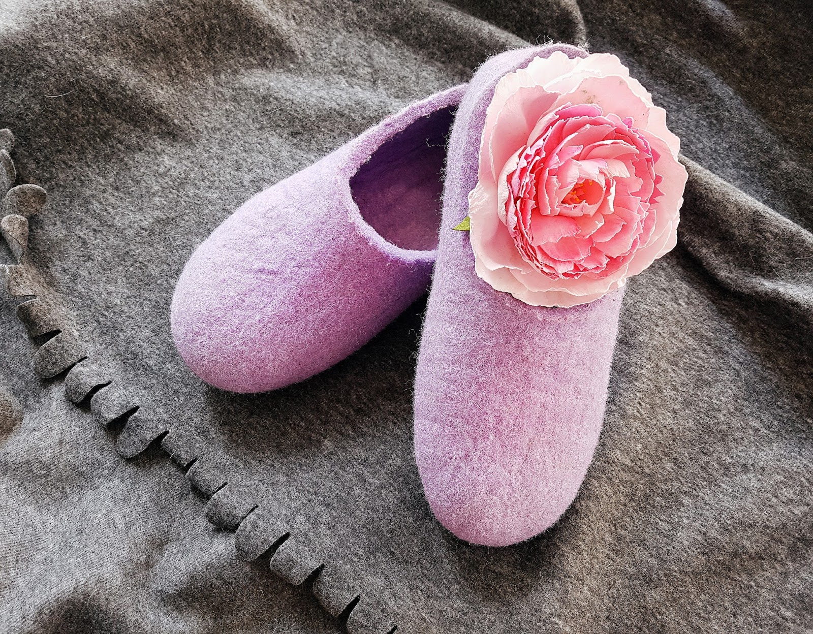 Now she creates unique products from felted wool, fabrics, decorative fibers and yarns. Felt is interesting not only because you can make practical, warm and quite often ethereal things, but also because it is a “fantasy field” made of soft merino wool tops, natural fabrics, decorative fibers. Felt is also like a canvas for her drawings. All sorts of images of flora and fauna are born with the help of colored wool. She loves to embroider floral motifs and patterns with animals on felt. There you could find many exclusive, warm, gentle and interesting items in wool in wet felting, needle felting and nunofelting technique. It could be clothes from Merino wool, strong Bergshaft wool, Natural organic sheep wool, angora, chiengora and other fiber. I felt clothing, scarfs, shawls and etc.I decided to order these cute violet slippers and they really kept me warm this winter :)